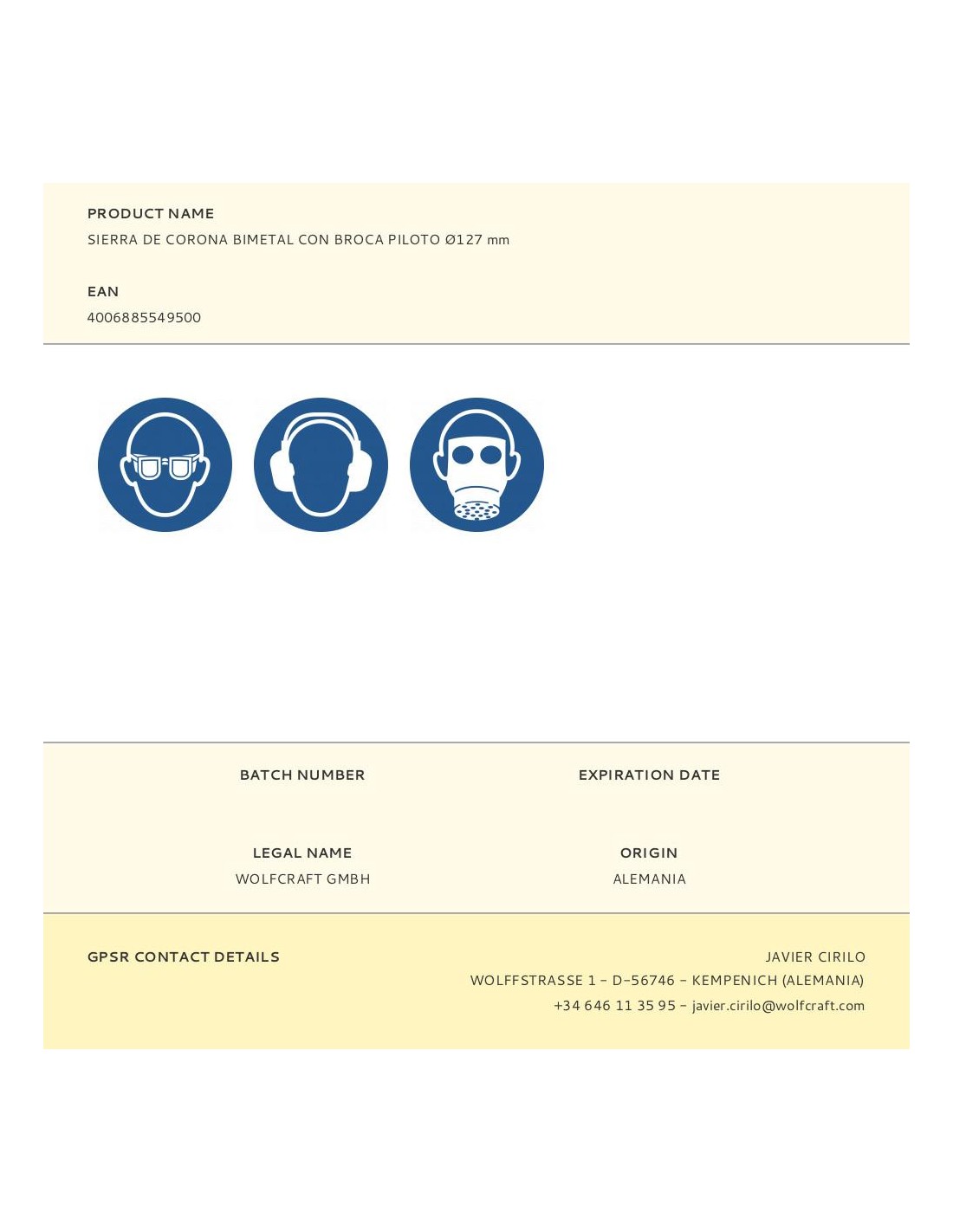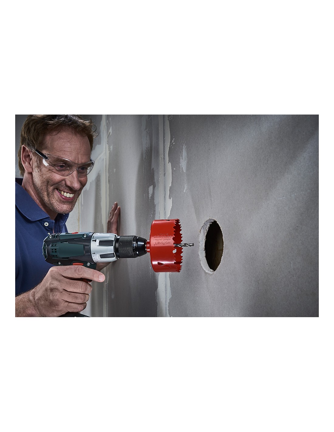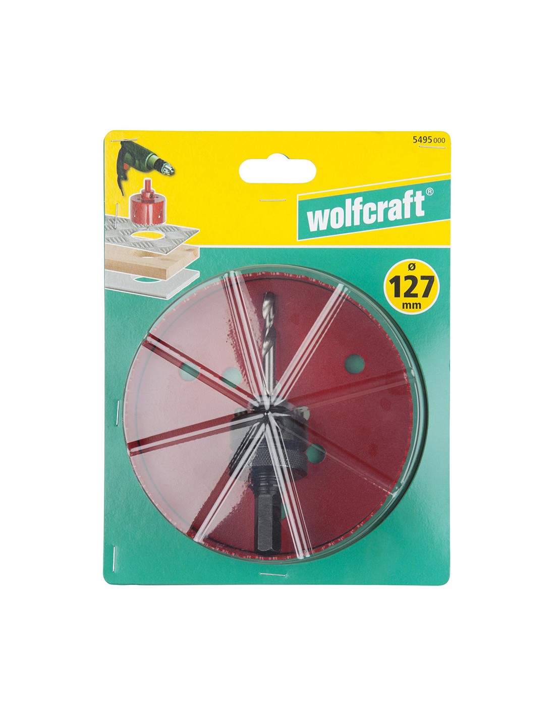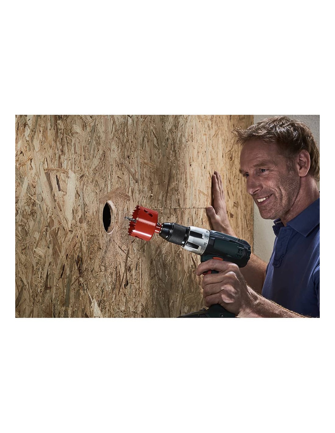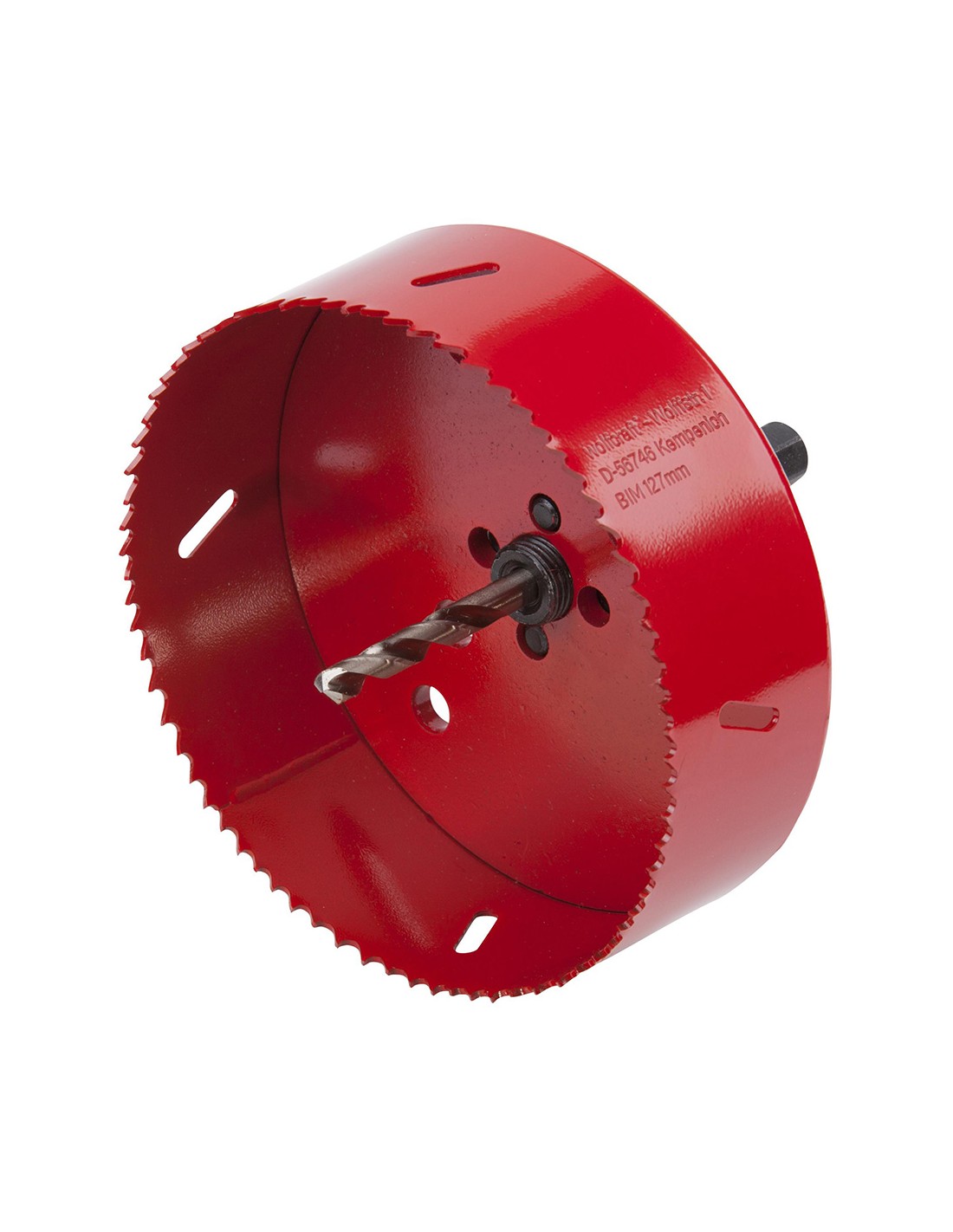 Sierra de corona bimetal de ø127 mm, profundidad de corte 40 mm, vástago hexagonal ø9,5 mm broca centradora hss ø6 mm. dentado variado progresivo de acero de alta velocidad (hss). para materiales de obra en seco, madera y plásticos