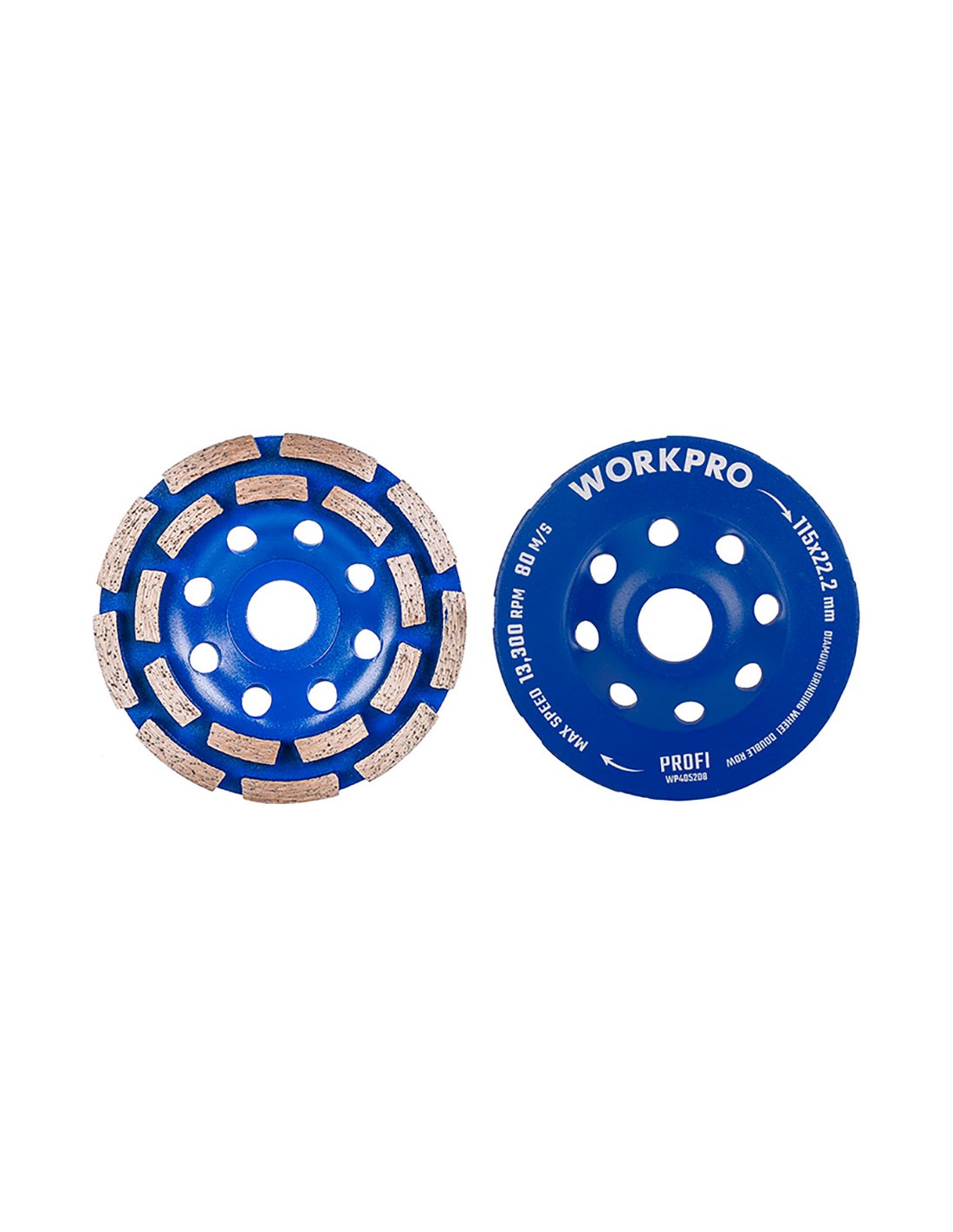 Muela copa diamantada, doble hilera dientes segmentados, ø115 x 22,2 mm x 16 dientes para pulido de hormigón y piedra dientes prensados en frío en hilera doble para un pulido rápido cuerpo de acero 65 mn máx. 13.300 rpm