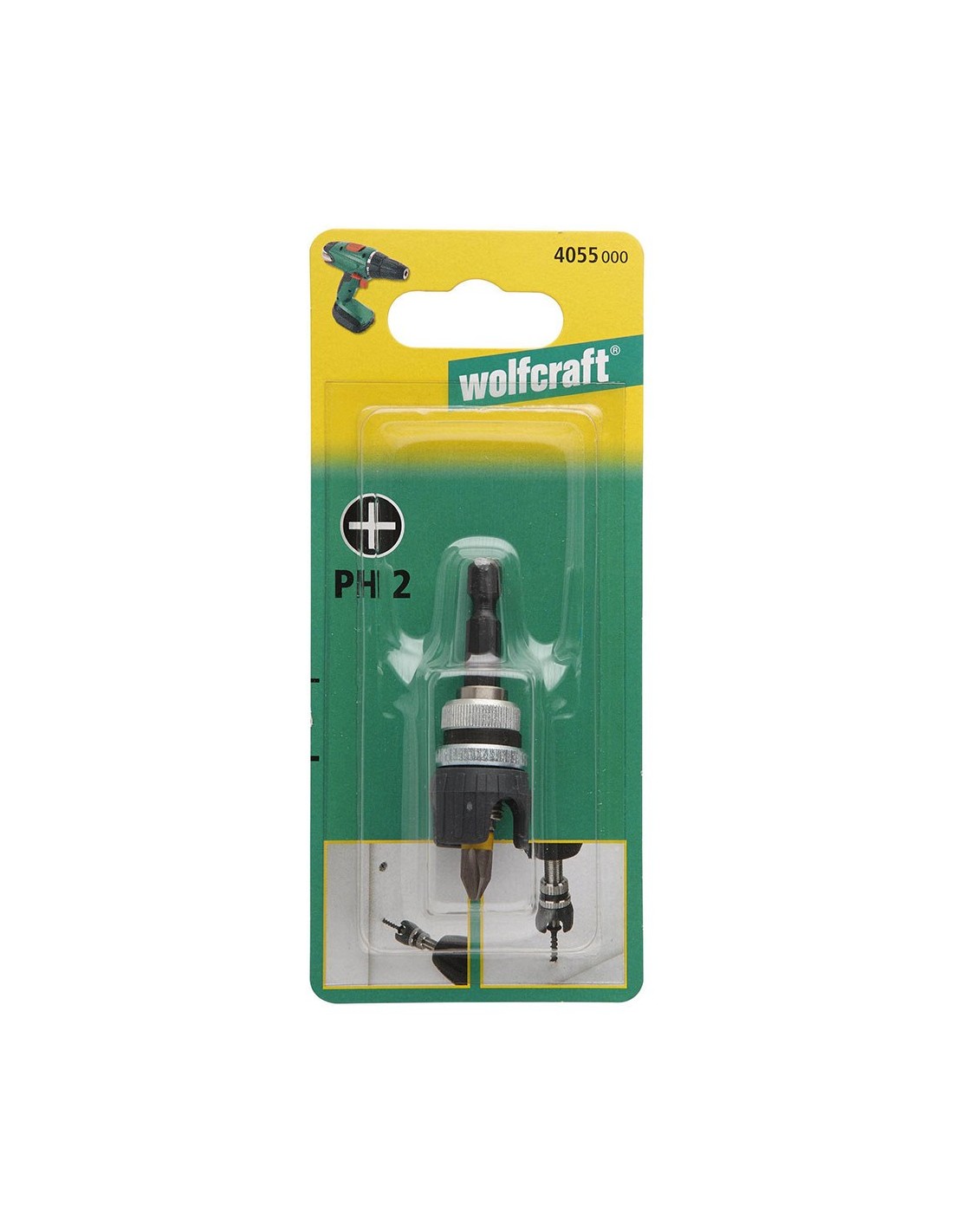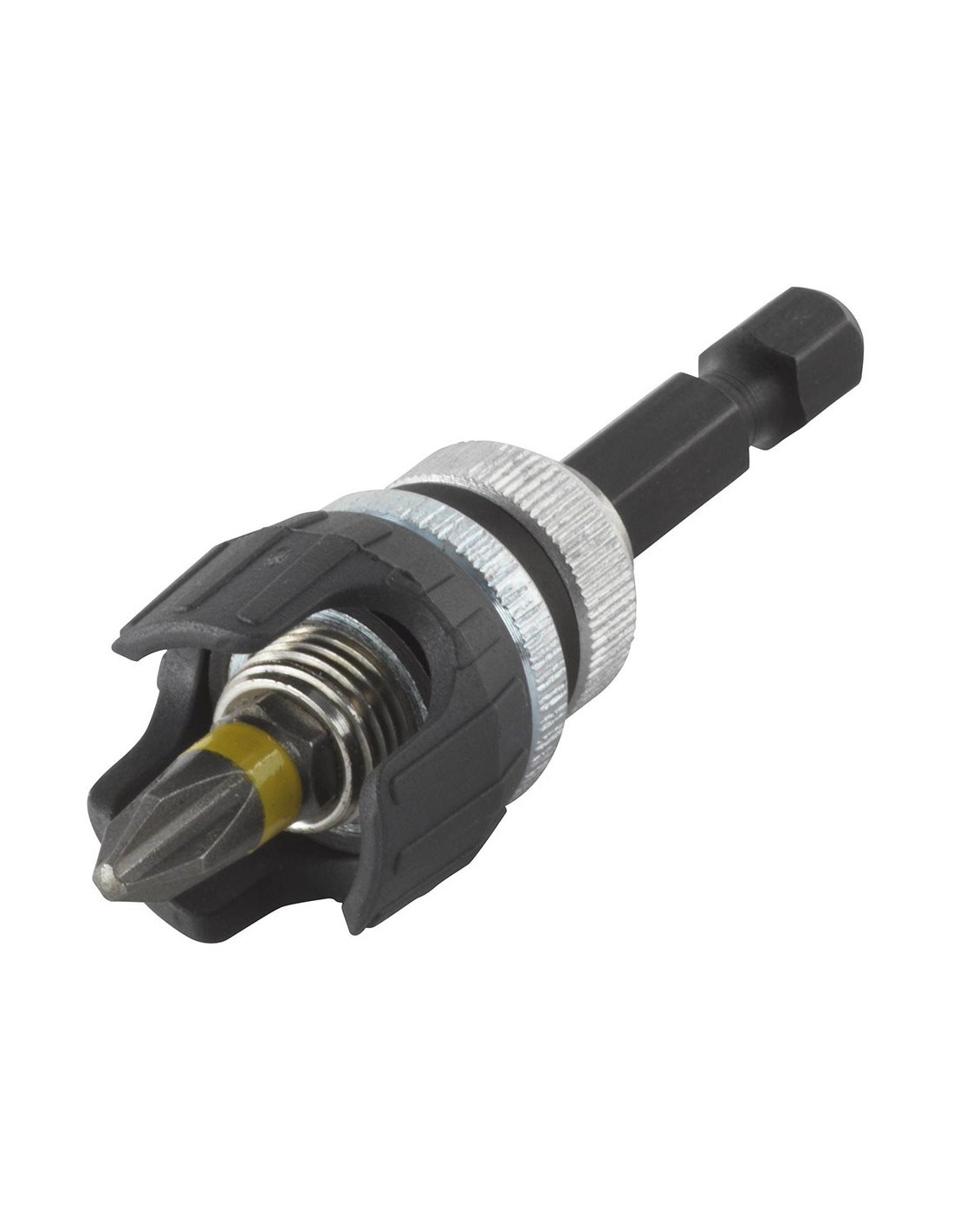 Portapuntas con tope de profundidad ajustable para trabajos de interior. permite atornillar placas de yeso, el imán sostiene el tornillo en la punta para simplificar el manejo. el capuchón de plástico proporciona una perfecta visión de la zona de trabajo. alojamiento hexagonal 1/4 pulg para cambio rápido de las herramientas. incluye: punta ph2