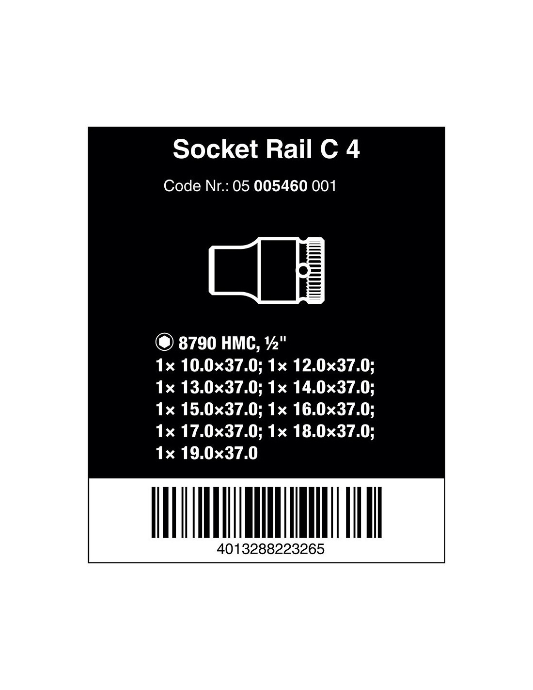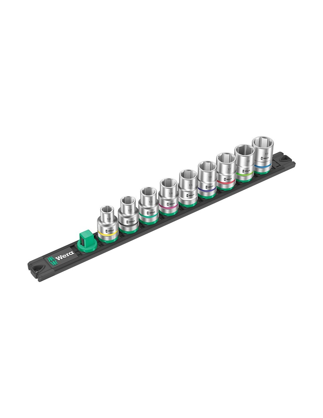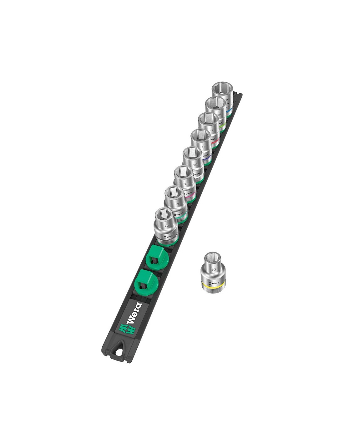 Vasos ½ pulg rail c4, juego 9 piezas, hexagonales ½ pulg x 370 mm, medidas 10, 12, 13, 14, 15, 16, 17, 18, 19, listón magnético, extracción fácil twist to unlock, se puede fijar temporalmente a la pared, la estantería o en el carro, sistema take it easy, marcas a color según el tamaño, para uso manual/máquina, no de impacto, ranura de retención de bola, moleteado en el extremo posterior para un mejor agarre
