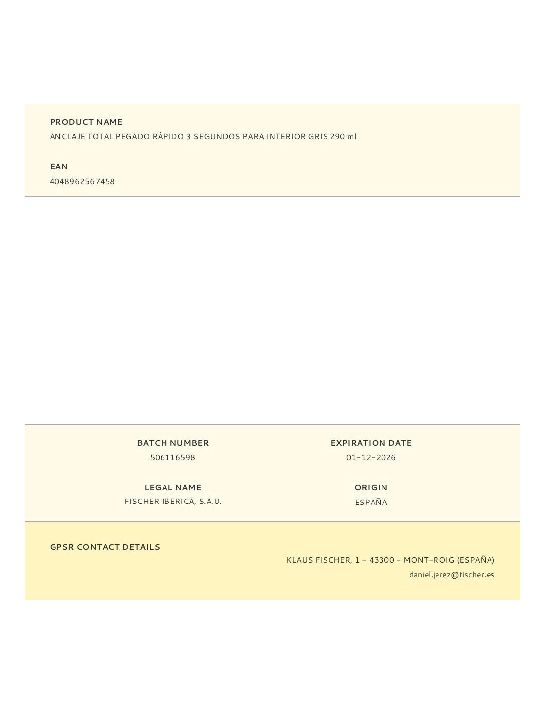 Anclaje total pegado rápido 3 segundos para interior/exterior, gris, 290 ml