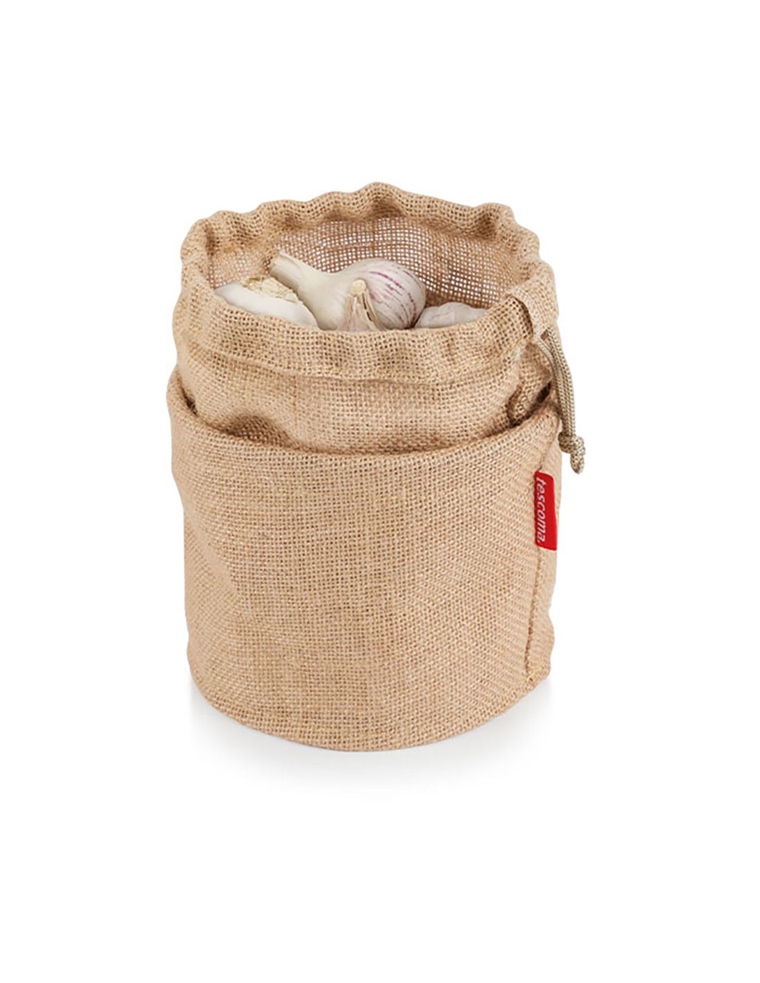 Saco 2,5 l para el almacenamiento de ajo, cebolla, patatas, nueces, etc. con cierre transpirable con cuerda para ajustar las verduras permanecen frescas durante más tiempo. fabricado de tela de yute natural con recubrimiento impermeable mantenimiento si es necesario, limpiar el interior del saco con un paño húmedo. no lavar en el lavavajillas, no lavar en lavadora.