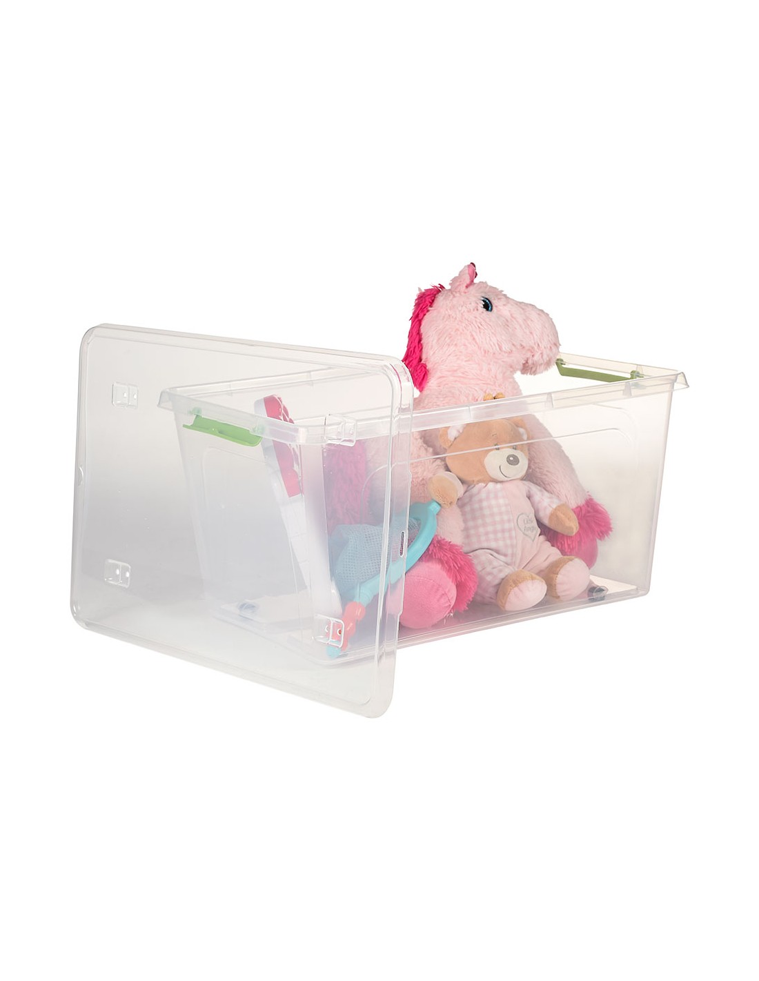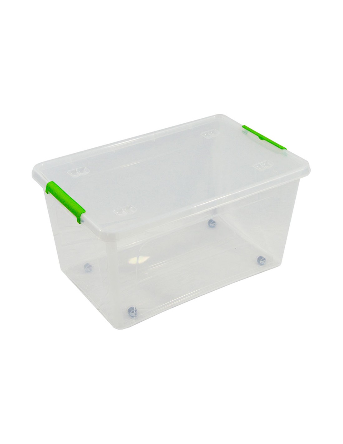 Caja transparente con ruedas y tapa con cierre verde, apilables gracias al hueco que contiene la tapa donde se encajan las ruedas de la otra caja, capacidad 44 litros, 58,5 x 39 x 30 cm