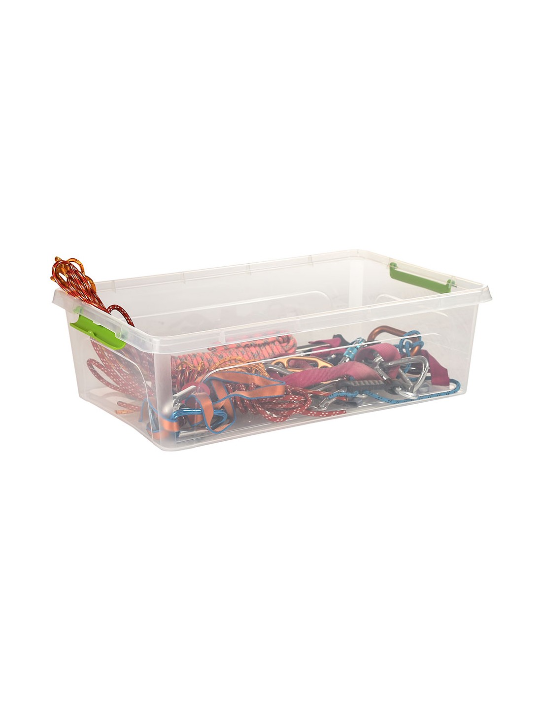 Caja transparente con ruedas y tapa con cierre verde, apilables gracias al hueco que contiene la tapa donde se encajan las ruedas de la otra caja, capacidad 29 litros, 58,5 x 39 x 17 cm