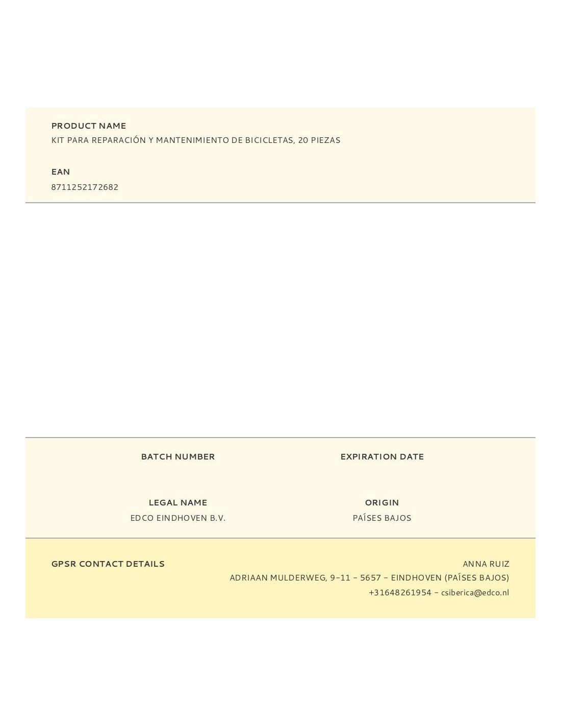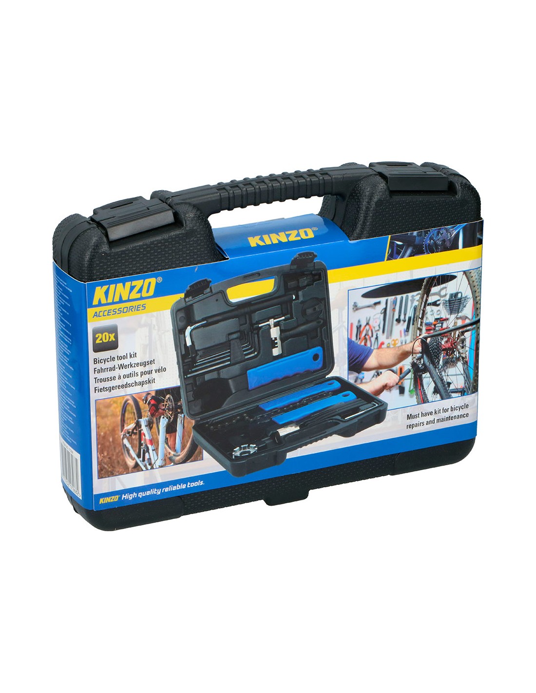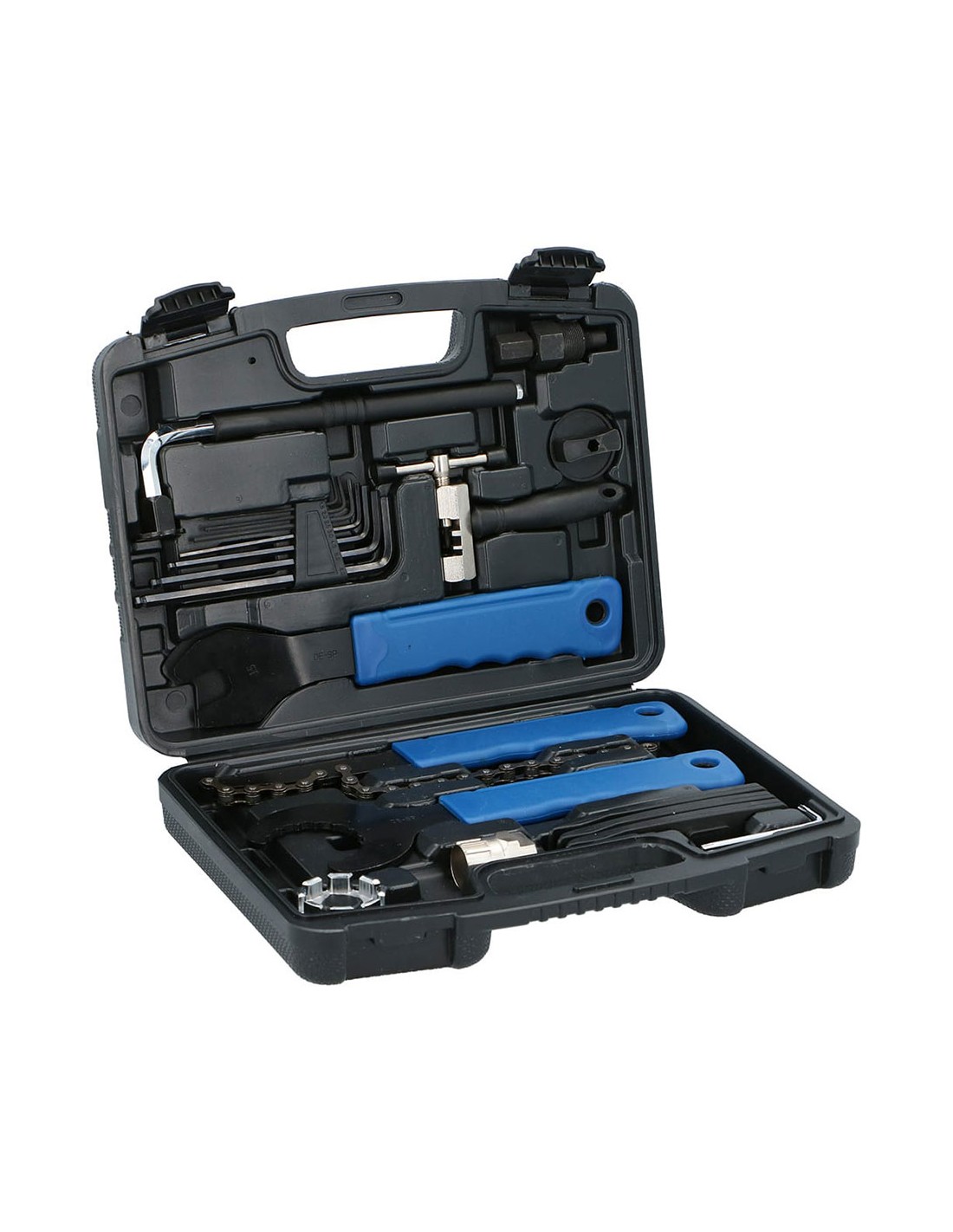 Kit para reparación y mantenimiento de bicicletas, incluye: llave de cadena, herramienta para carcasas de rodamiento, llave para pedales 15 mm, llave allen 8 mm, llave o extractor de vaso, 6 llaves allen (2/2,5/3/4/5/6 mm) las de4/5/6 mm con cabeza de bola, 3 palancas para ruedas, tronchacadenas (6 - 10 velocidades), llave para radios(9/10/11/12/13/14/2 x 15), extractor de bielas de tipo cuadradillo, herramienta para bielas para platos y bielas hollowtech ii, extractor para cassettes shimano hg, llave torx (t25) y maletín para guardar y transportar de 28,5 x 6 x 21 cm
