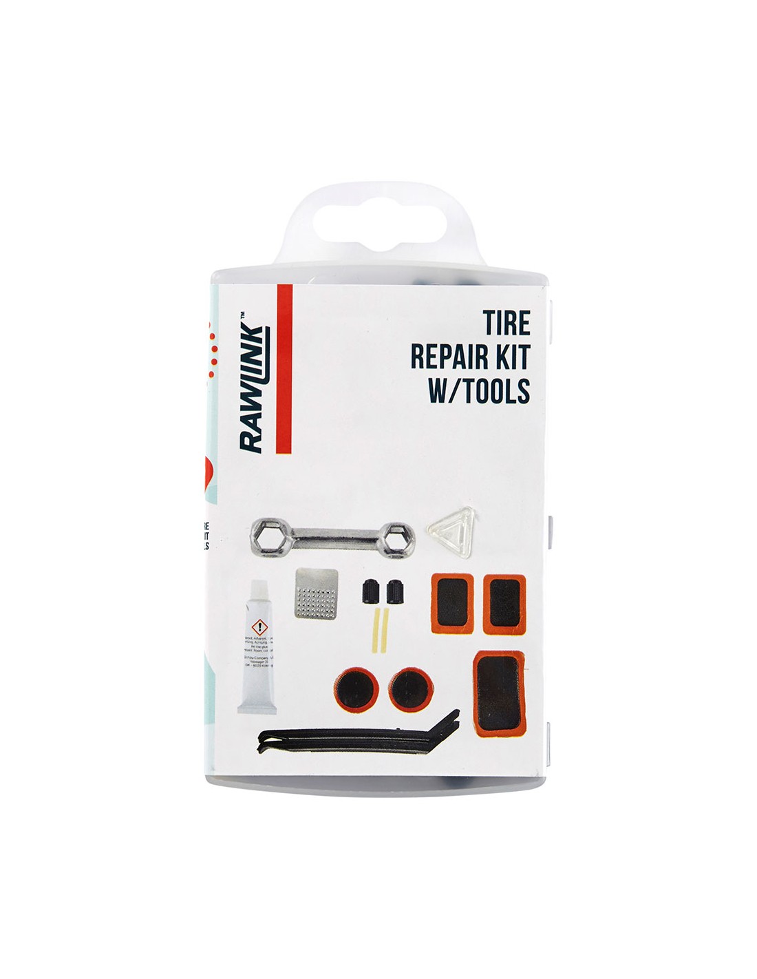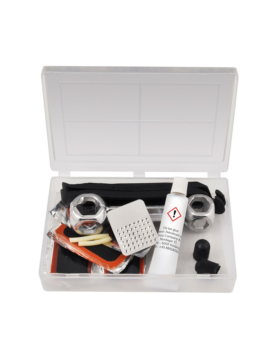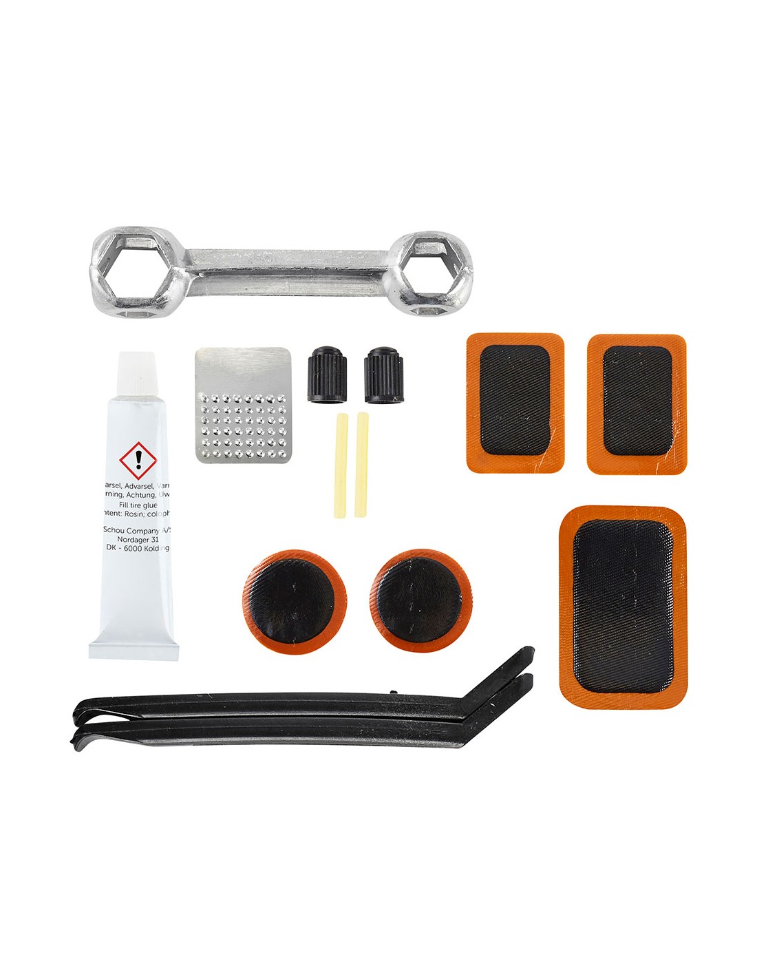 Kit reparación pinchazos con herramienta, 14 piezas incluye: 1 llave inglesa fija multiple, 1 tubo de pegamento, 2 palancas de plástico para neumáticos, 2 válvulas, 2 tapones de válvula, 1 raspador, 5 gomas para cámara (2 de 30 x 25, 1 de 50 x 30, 2 de ø25 mm)