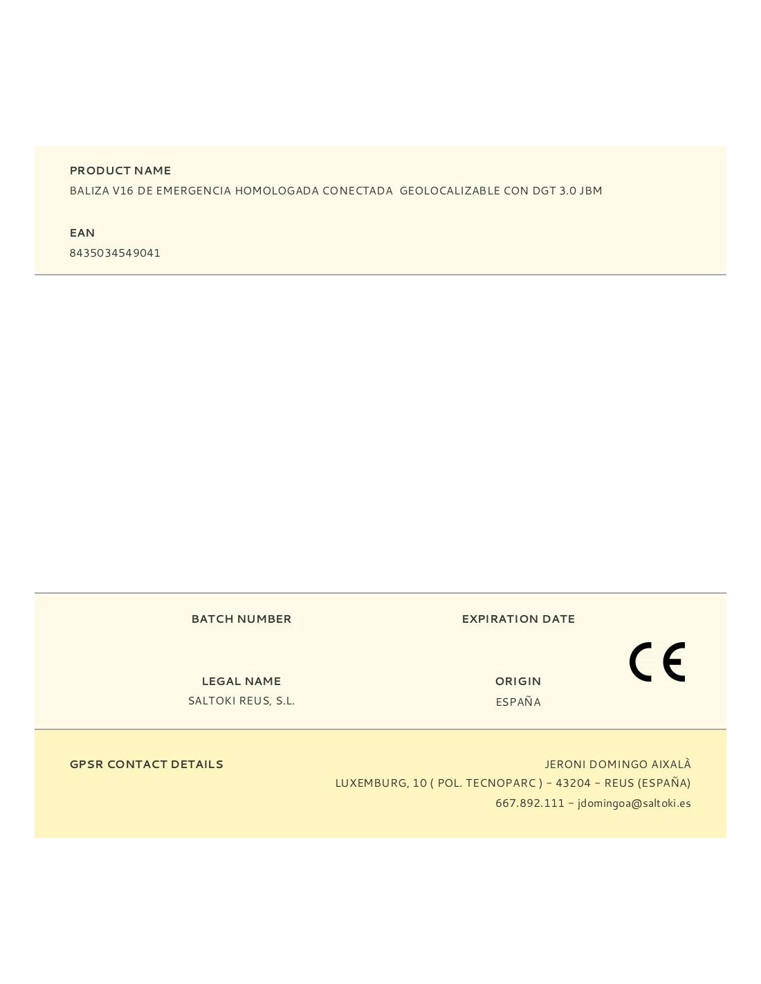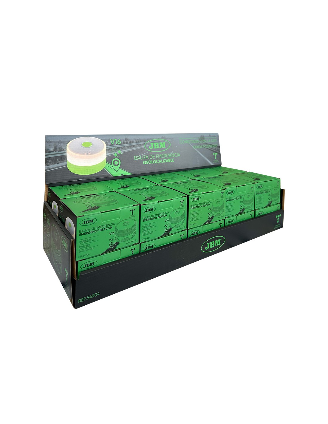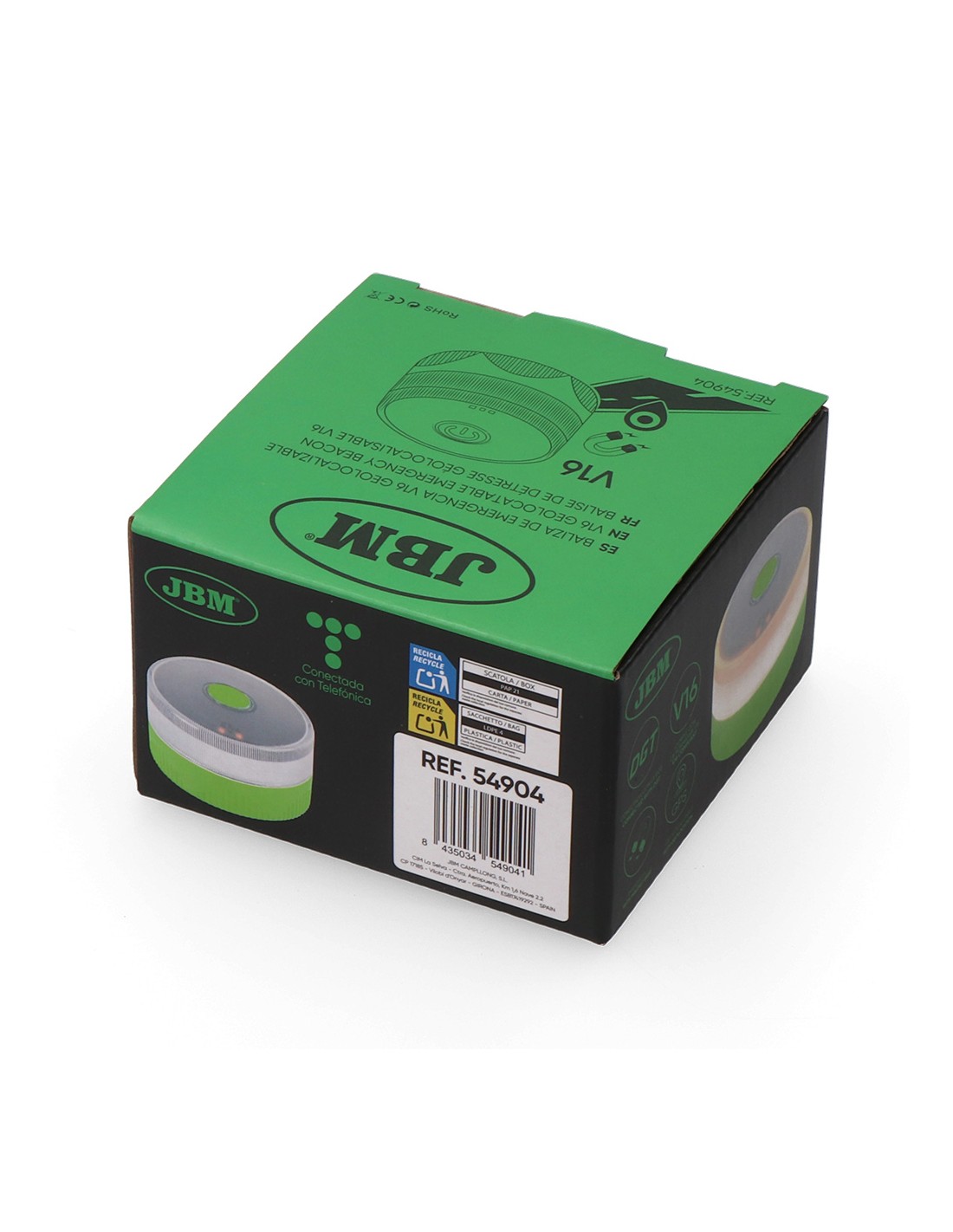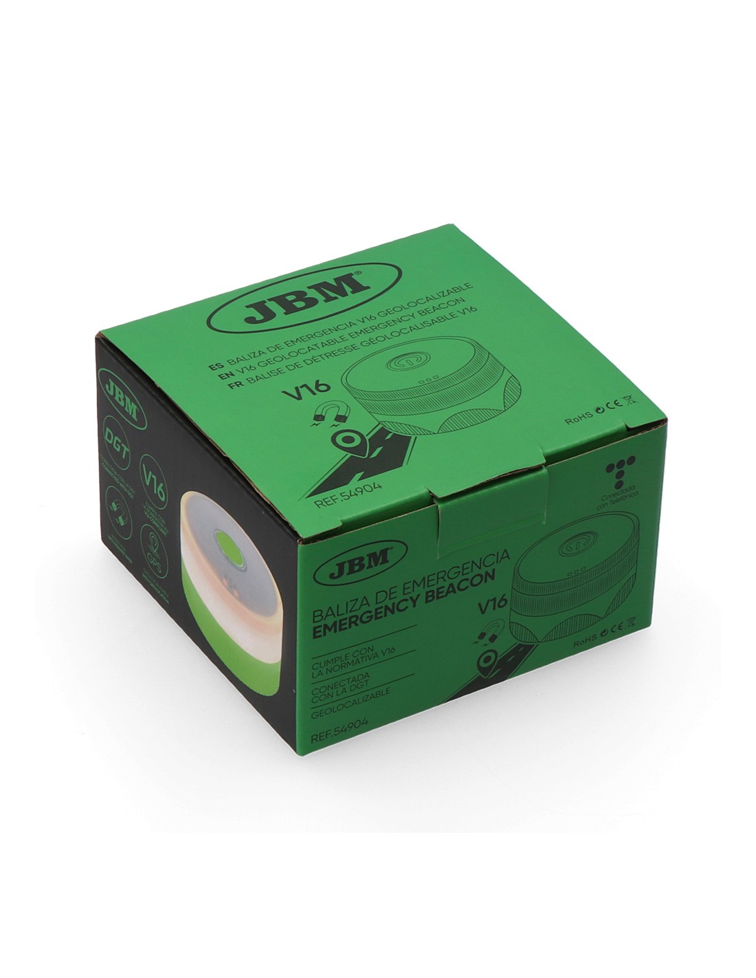 Baliza v16 de emergencia homologada conectada geolocalizable con dgt 3.0 jbm sim válida hasta 12/2038 ip54, visible a 1 km 360° -20 y 50°c 180 pa 1800 kelvin, sujeción magnética dos horas de autonomía, funciona con 3 x aa pilas incluidas ø82 x 49 mm, presentado en expositor de 20 uds