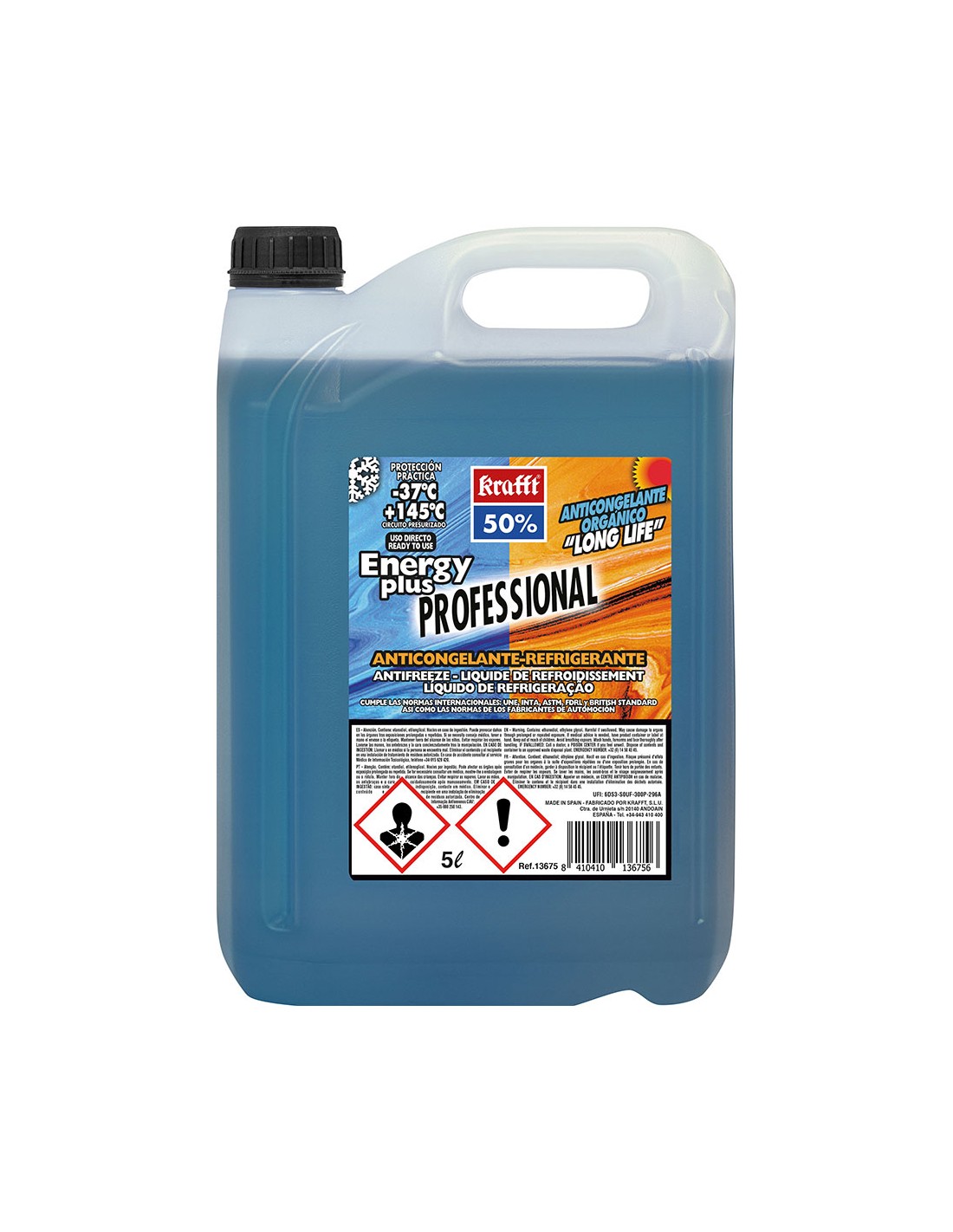 Anticongelante energy plus 50%, professional, 5 l, azul, normas que cumple: une 26.361.88 , inta 157413, astm d 3306, astm d4656, jis k 2234 llc, sae j-1034, astm d 4985, astm d 5345, federal standard o-a-548d, jaso m325 llc, afnor nf r 15601, nato s-759, british standard 6580, sae j-814. especificaciones oem que supera (sfu): vw tl 774 f (g-12+), pvi/rnur 41-01-001 tipo d, ford wss-m97b44-m, daf mat 74002, volvo 260, psa b71 5110, mercedes 325.3, man 324 tipo snf, scania tb-1451, mtu mtl 5048, gm 6277m