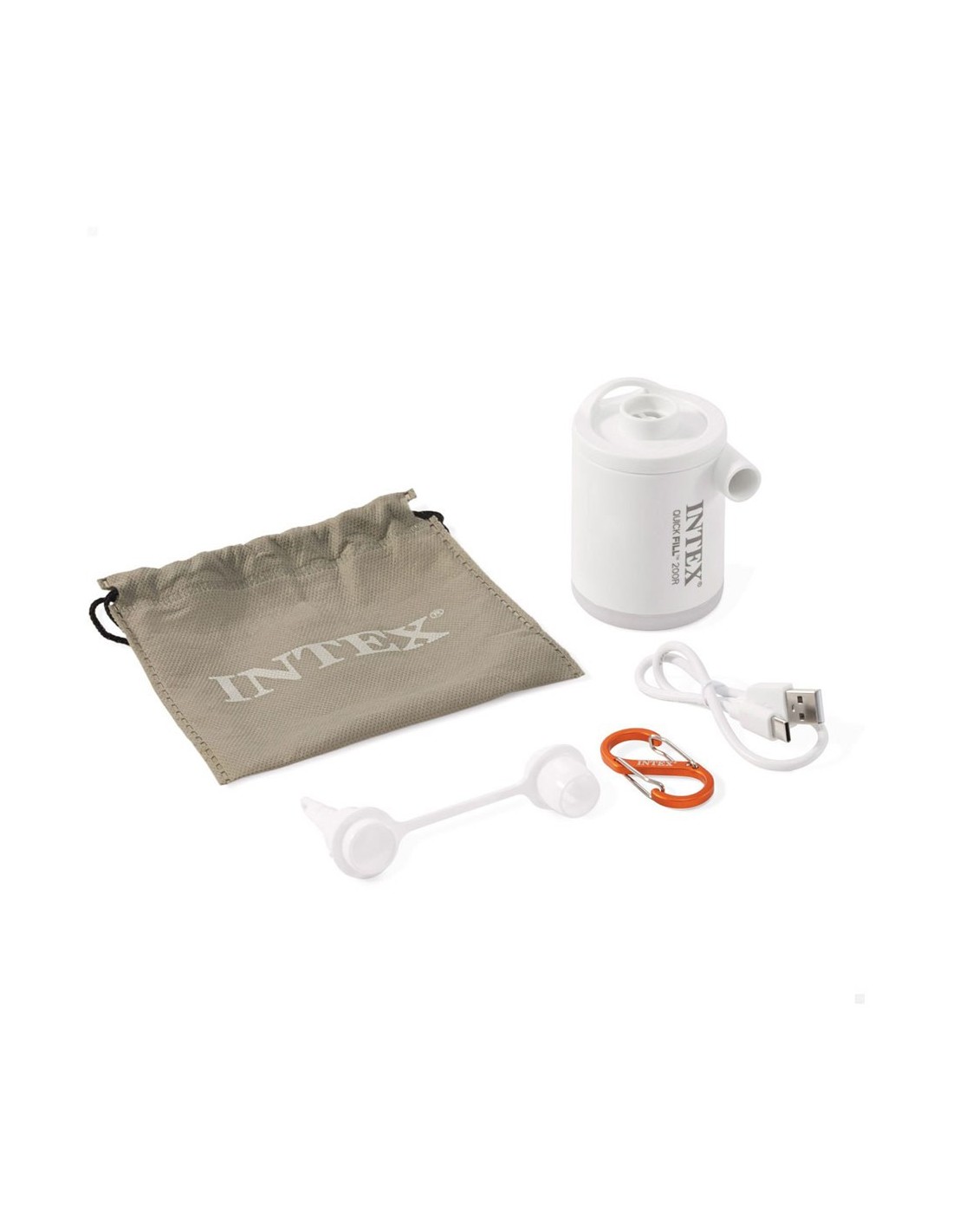 Mini bomba eléctrica de aire con luz led, modelo quick fill, batería recargable de polímero de litio, 3,7 v, 2000 mah, carga rápida en 2-3 h con cable usb-c incluido, duración de funcionamiento para 18 minutos, capacidad para 200 l/min, apta para hinchar y deshinchar, incluye 2 boquillas de interconexión adaptables para casi todas las válvulas, bolsa de almacenamiento y mosquetón para colgar, ideal para inflables