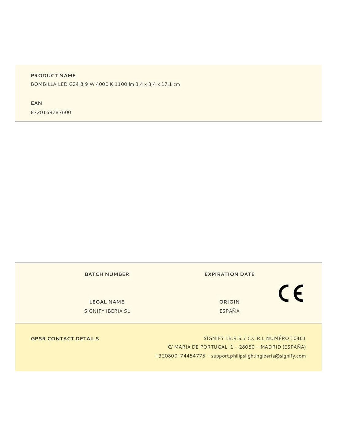 Bombilla led g24 8.9 w (equiv. 26 w) 4000 k, 1100 lm, cri 82, clasificación energética e, vida útil: 30.000 h, 220-240 v ac 50/60 hz. flujo luminoso 360°. dimensiones: 3,4 x 3,4 x 17,1 cm