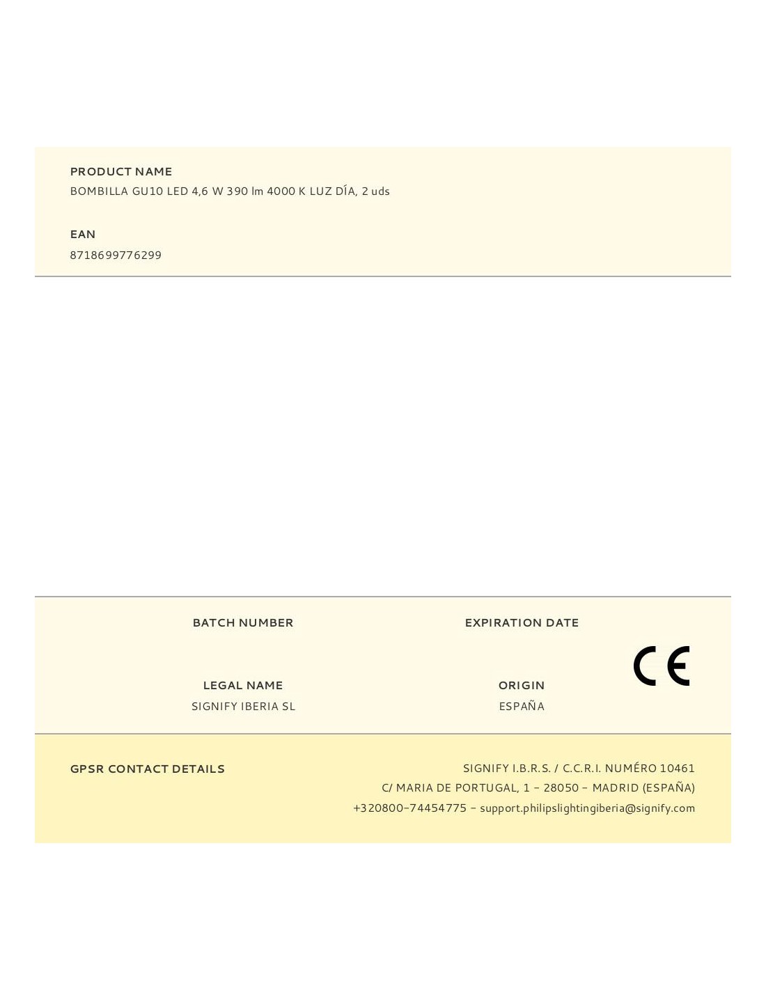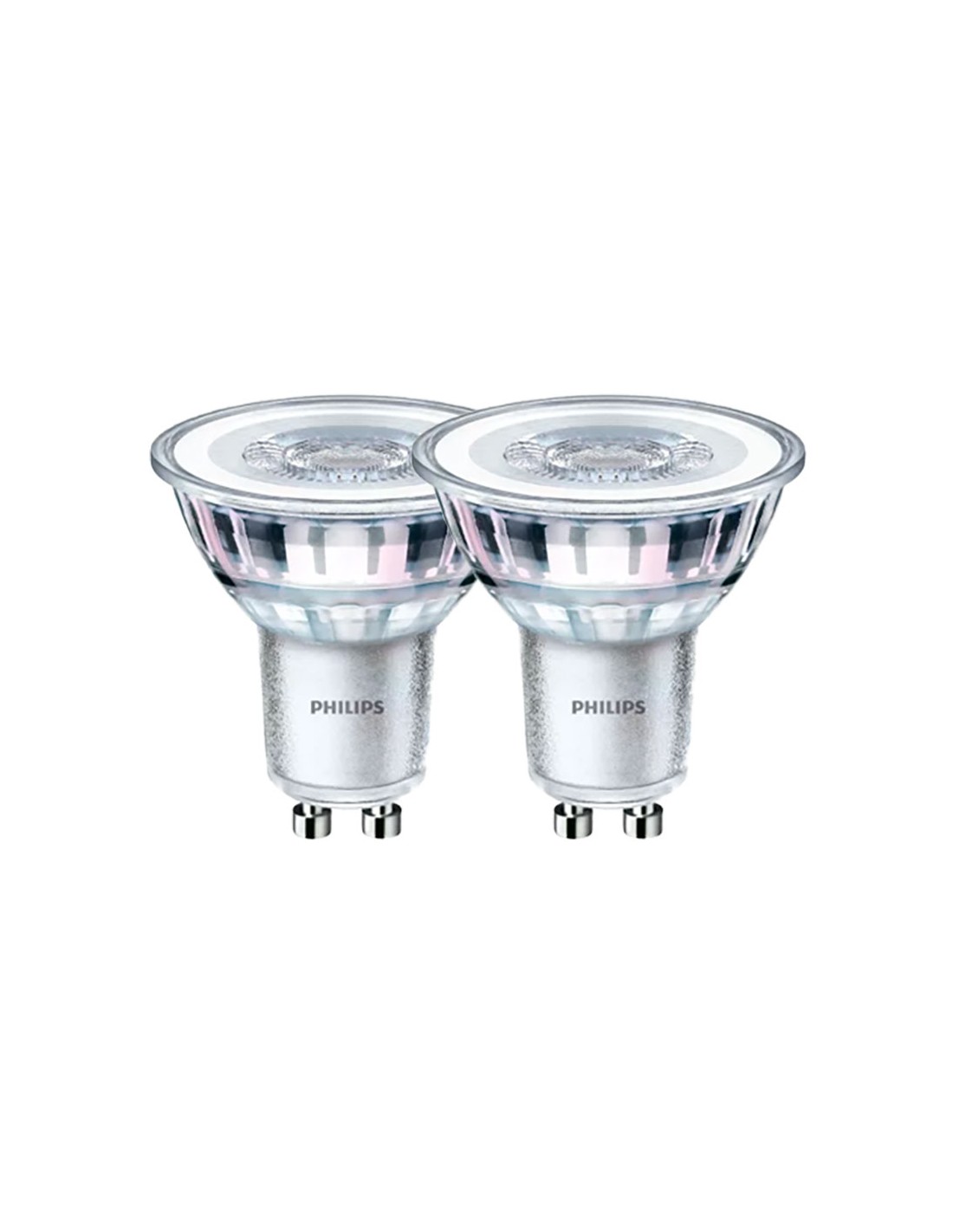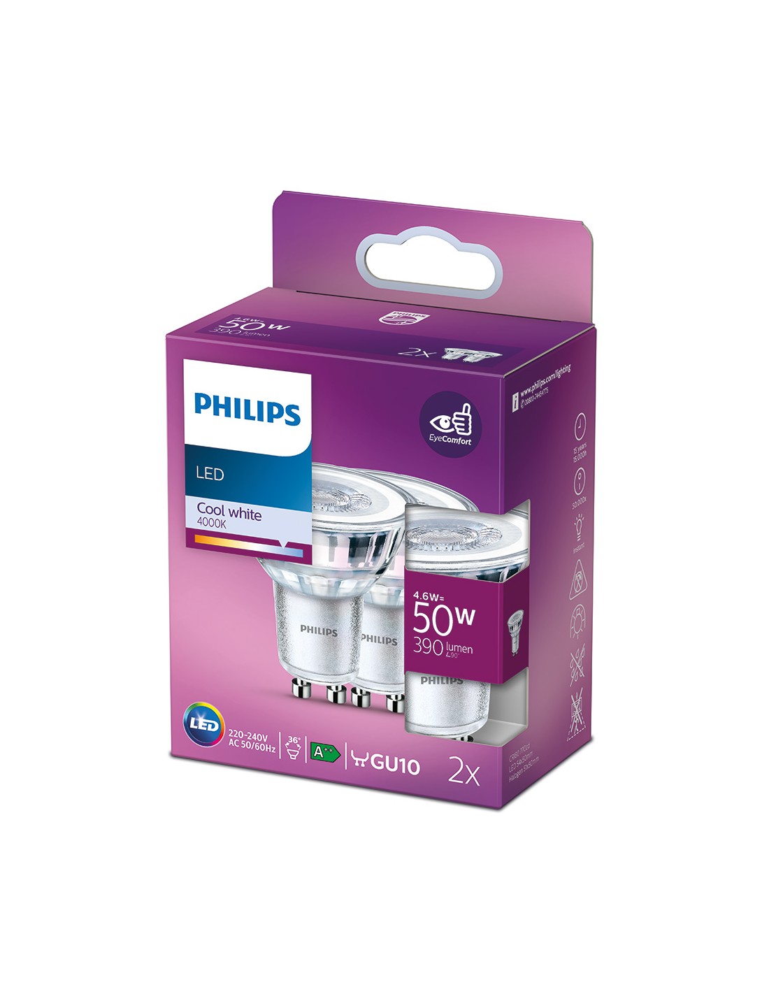 Bombilla gu10 led 4,6 w (equiv. 50 w) 390 lm 4000 k luz día, cri 80, clasificación energética f, vida útil: 15.000 h, 220 - 240 v ac 50/60 hz. flujo luminoso 90° dimensiones: ø5 x 5,4 cm. 2 uds