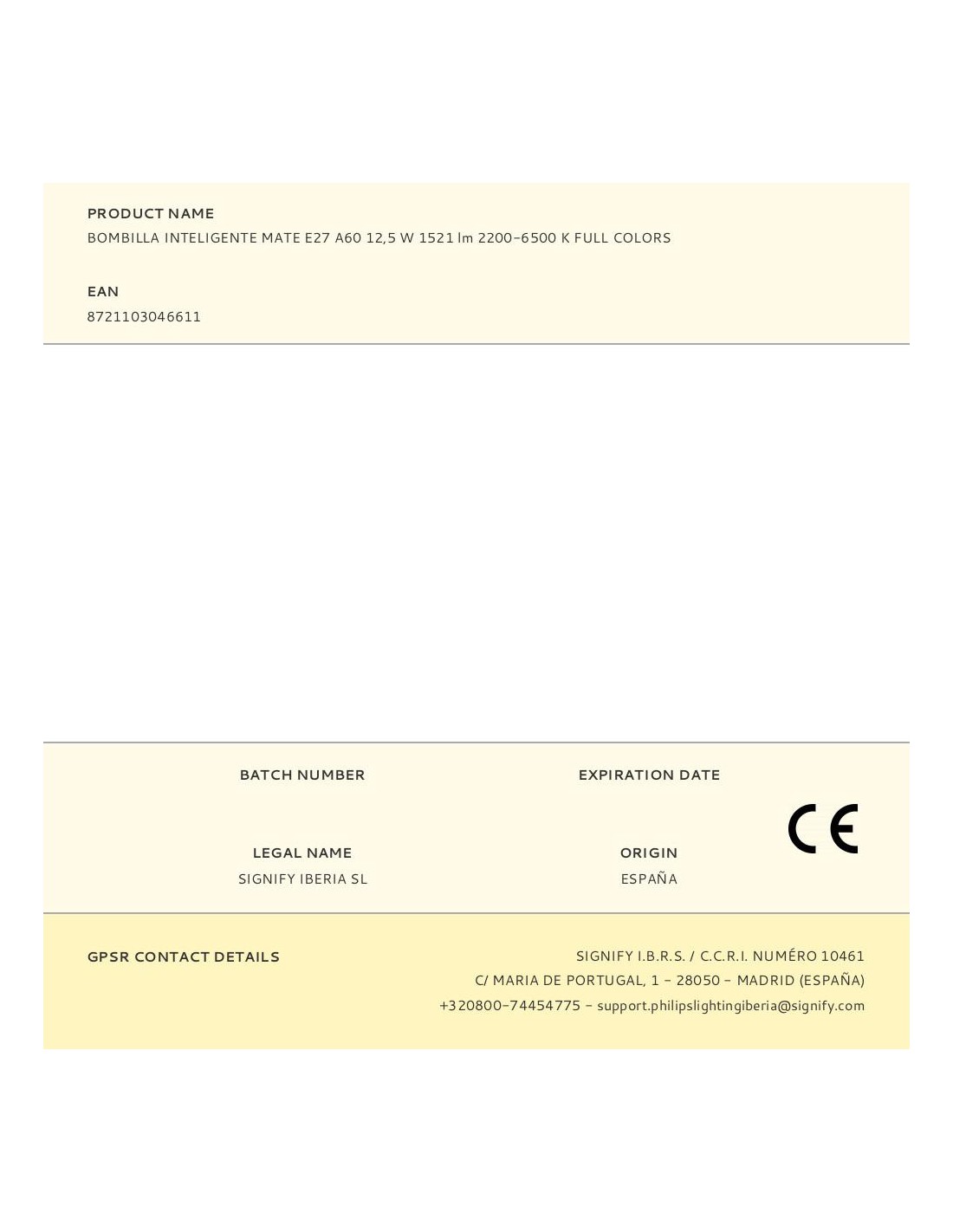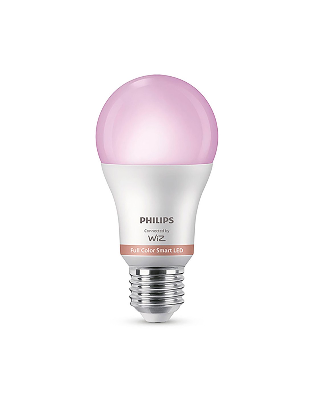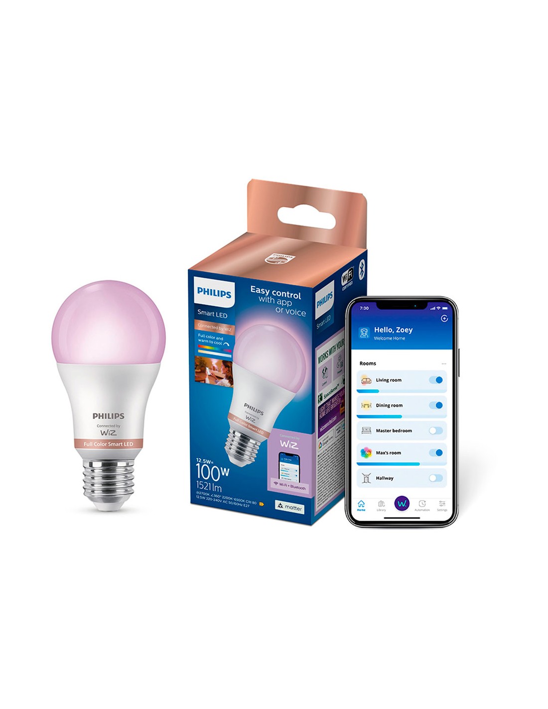 Bombilla inteligente mate e27, 12,5 w, a todo color y de luz fría a cálida, 2200 - 6500 k, 1521 lm, control por aplicación wiz o por voz, vida estimada 15000 h, flujo luminoso 360°, 220 - 240 v ~50/60 hz, clase energética e, dimensiones ø60 x 122 mm