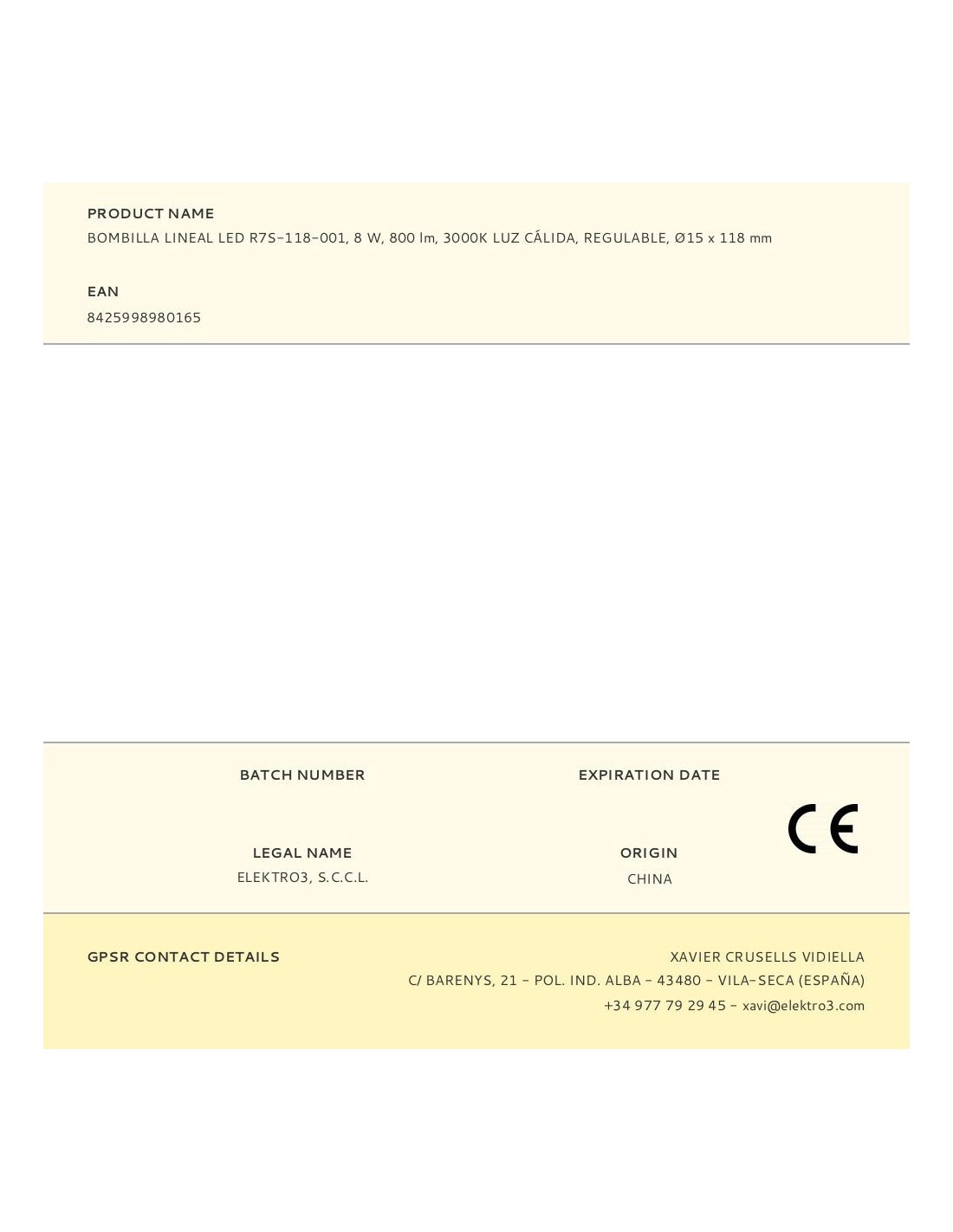Bombilla lineal led r7s, 8 w, 900 lm, 3000 k, luz cálida, regulable, clase energética e, vida estimada 15.000 h, ángulo de apertura 300°, tipo flujo luminoso 360°, 220-240v~50/60 hz, ø15 x 118 mm