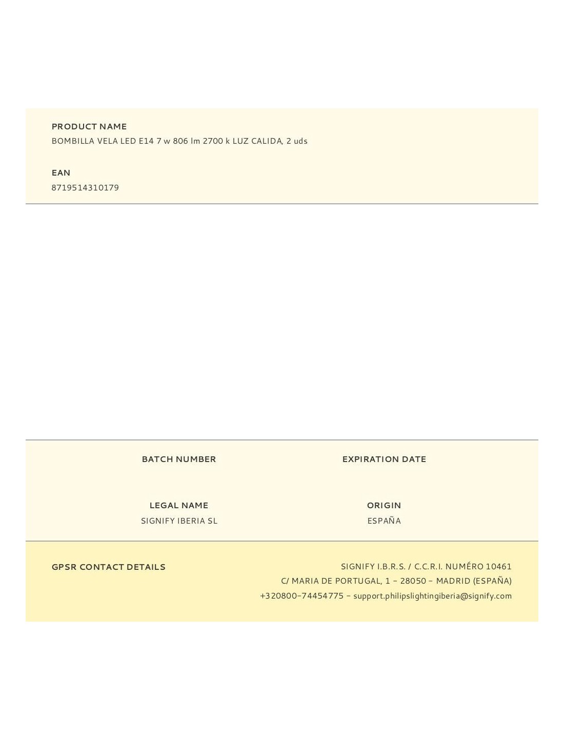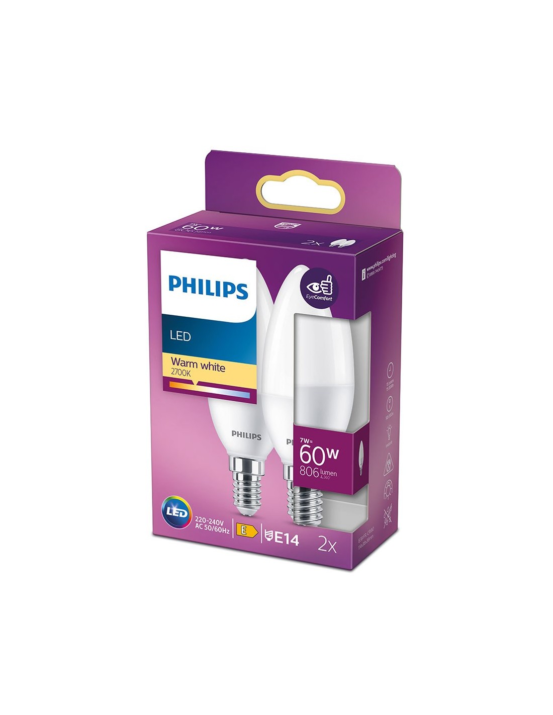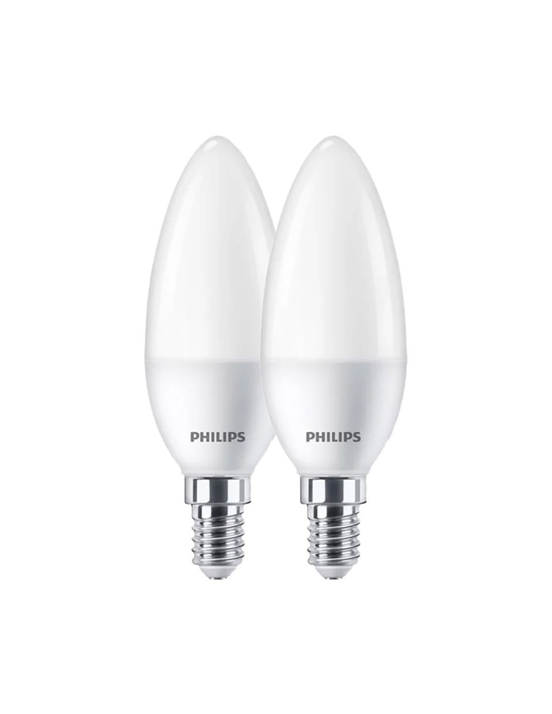 Bombilla vela led e14 7 w equivalencia 60 w 806 lm 2700 k luz cálida cri 80 clasificación energética e vida útil: 15.000 h 220 - 240 v ~ 50/60 hz flujo luminoso 360°, no regulable dimensiones: 3,8 x 3,8 x 11,4 cm 2 uds