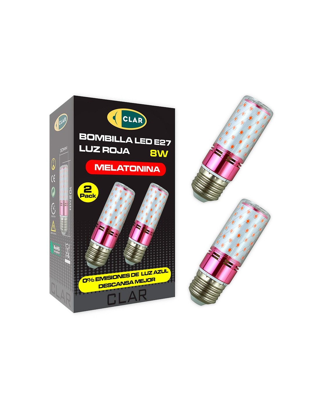 Bombilla tubular roja melatonina e27 8 w, 150 lm, 220-240 v ac 50-60 hz, vida útil 25000 h, ángulo de apertura 280°, clase energética f, cri 80. temperatura de trabajo: -20°c ~ +40 °c. 0% emisiones de luz azul, descansa mejor. dimensiones: ø30 × 102 mm. pack de 2 uds