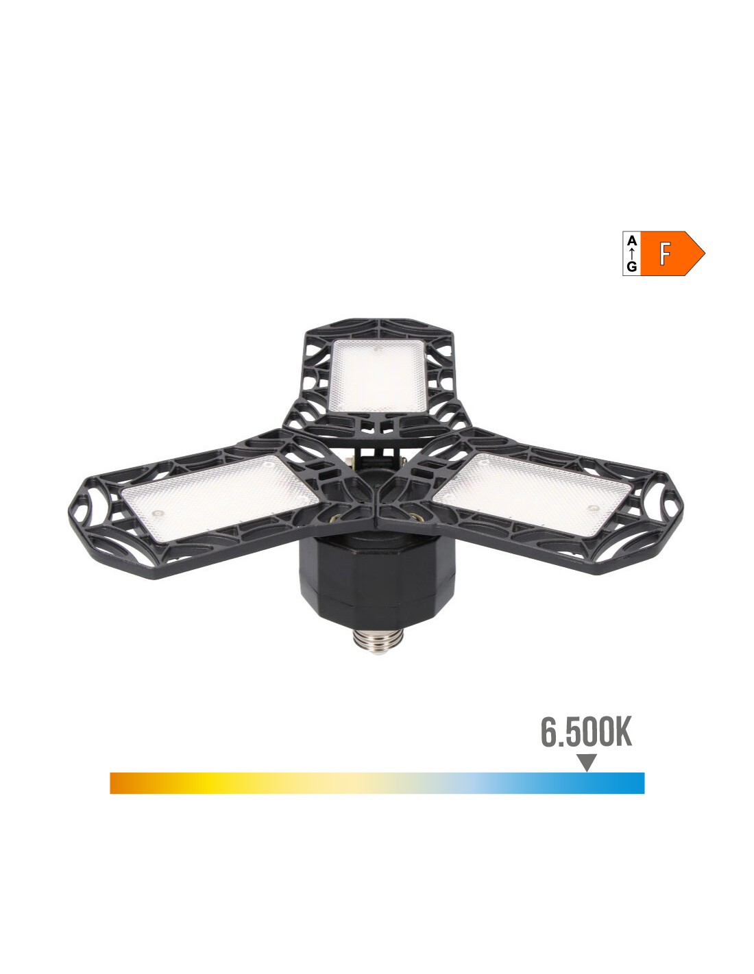 Bombilla "leaf" led e27 60w 6400lm 6500k luz fria edm. esta bombilla esta compuesta por 3 luminarias plegables hasta 90°, grado de apertura de luz 180° a 360° fabricada en plastico y aluminio. ip20, 72 leds, ideal para garajes, almacenes... medidas: ø26,5x12cm 220-240v
