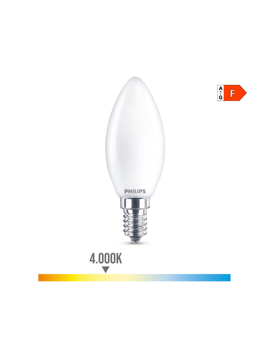 Bombilla vela led e14 4,3w 470lm 4000k luz dia. medida: ø3,5x9,7cm ( diámetro/alto) 15000h. ac 220-240v. cristal mate. no regulable. irc: 80. angulo de apertura 360°. equivalencia: 40w. philips