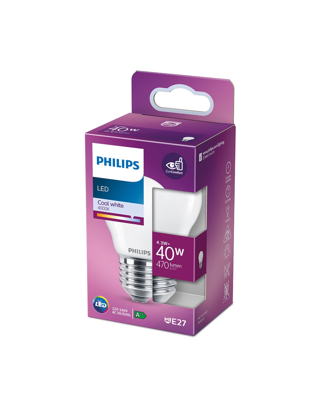 Bombilla esferica led e27 4,3w 470lm 4000k luz dia medida: ø4,5x7,8cm (diámetro/alto) 15000h, ac 220-240v cristal mate, no regulable, irc:80 angulo de apertura 360° equivalencia: 40w. philips