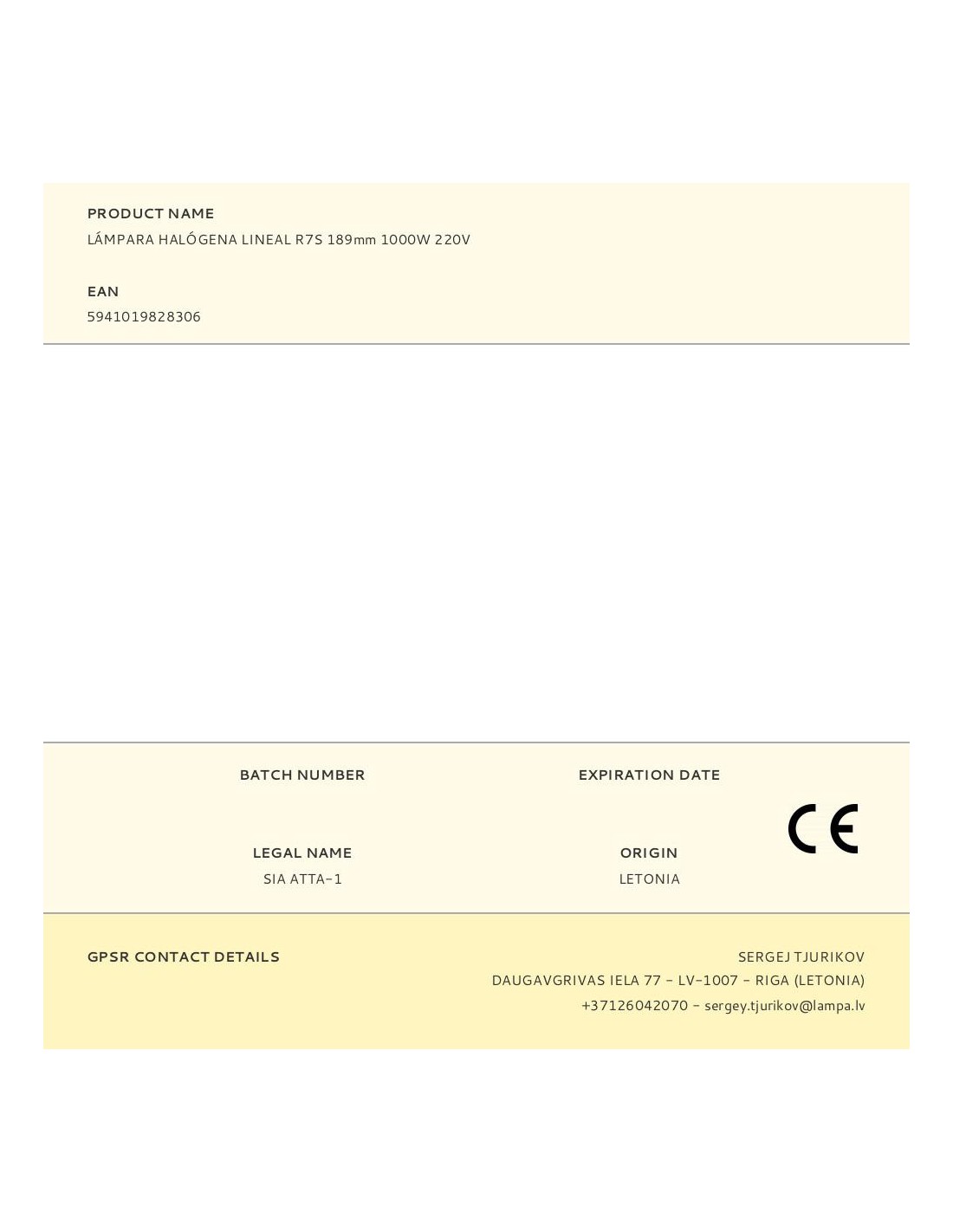 Lámpara halógena lineal regulable, casquillo r7s, 1000 w, 16500 lm, vida estimada 2000 h, 220 - 240 v ~50/60 hz, clase energética e, 189 mm