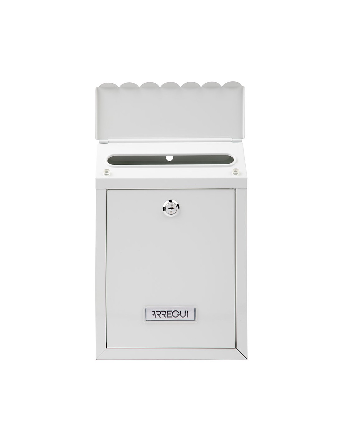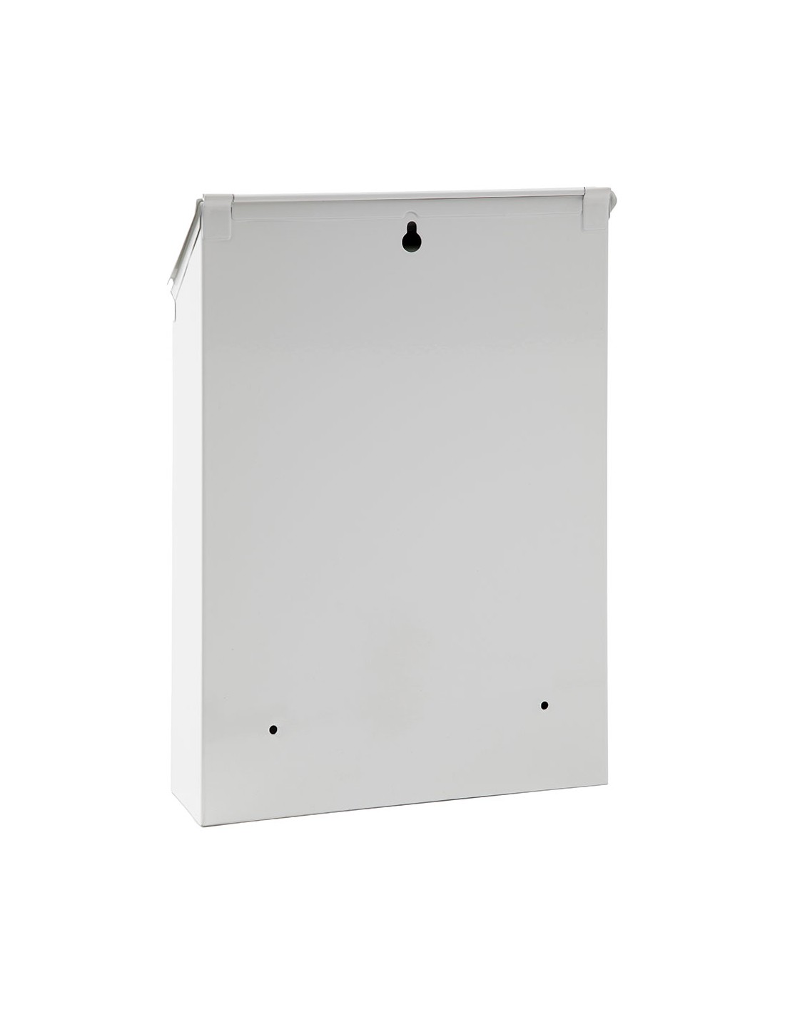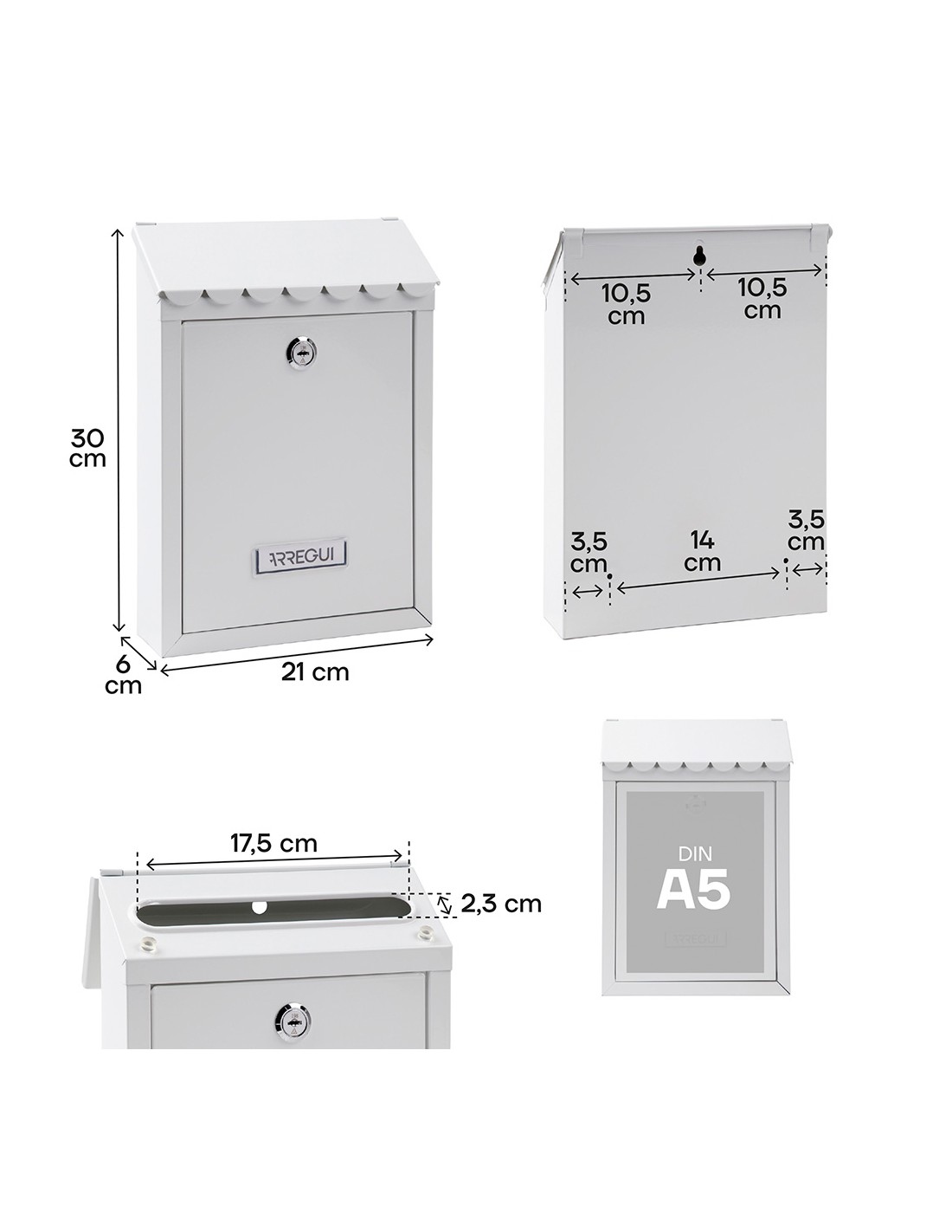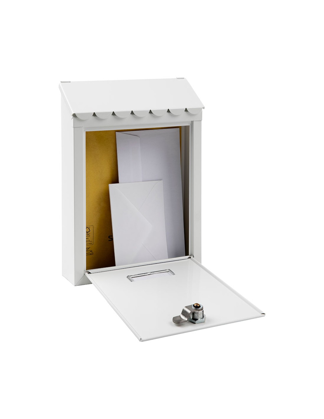 Buzón individual para exterior tamaño s (a5), acero galvanizado lacado blanco. tapa superior con forma de tejadillo que oculta la boca, la protege del agua de la lluvia apertura de puerta lateral incluye tarjetero, dos llaves y tornillos resistente a los rayos uv medidas: boca 17,5 x 2 cm, exterior 21,6 x 8 x 30 cm