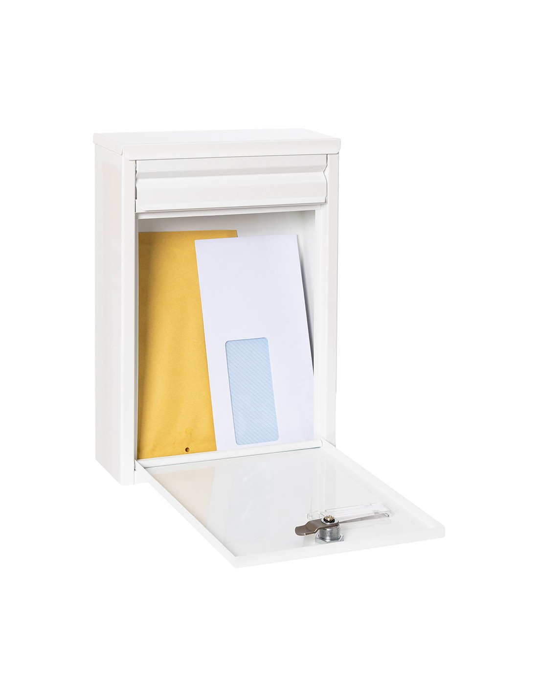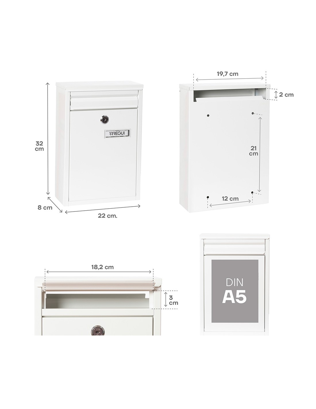Buzón individual para exterior tamaño s (a5), fabricado en acero galvanizado lacado blanco se puede usar como recoge cartas gracias a su apertura posterior apertura de puerta vertical incluye tarjetero, dos llaves y tornillos resistente a los rayos uv medidas: boca 18,2 x 3 cm, recogecartas 19,7 x 2 cm, exterior 22 x 8 x 32 cm