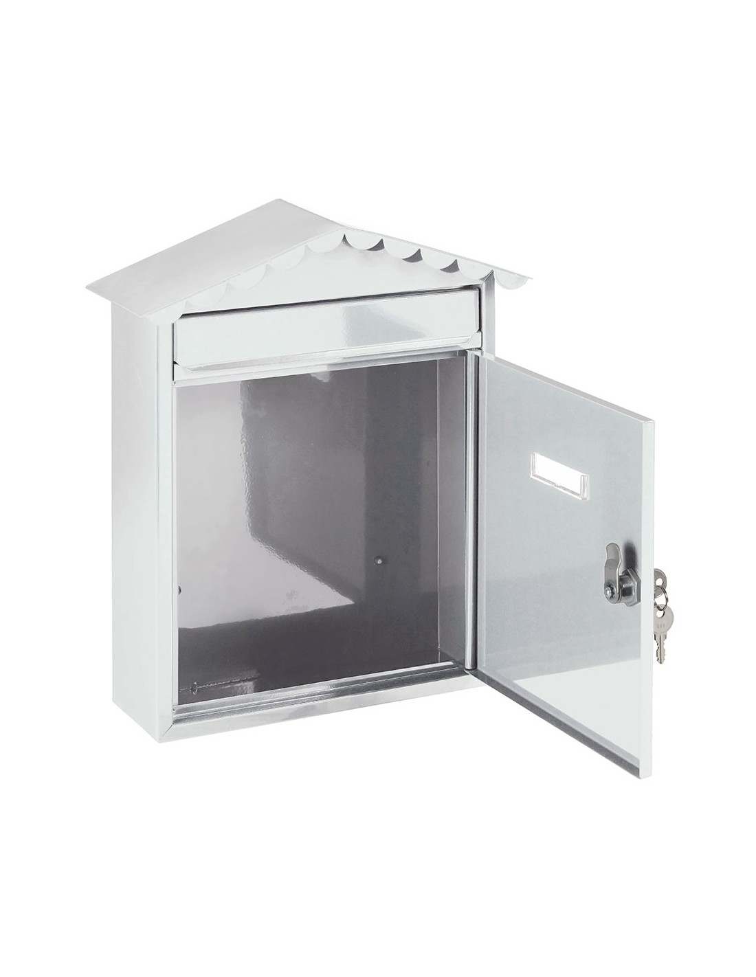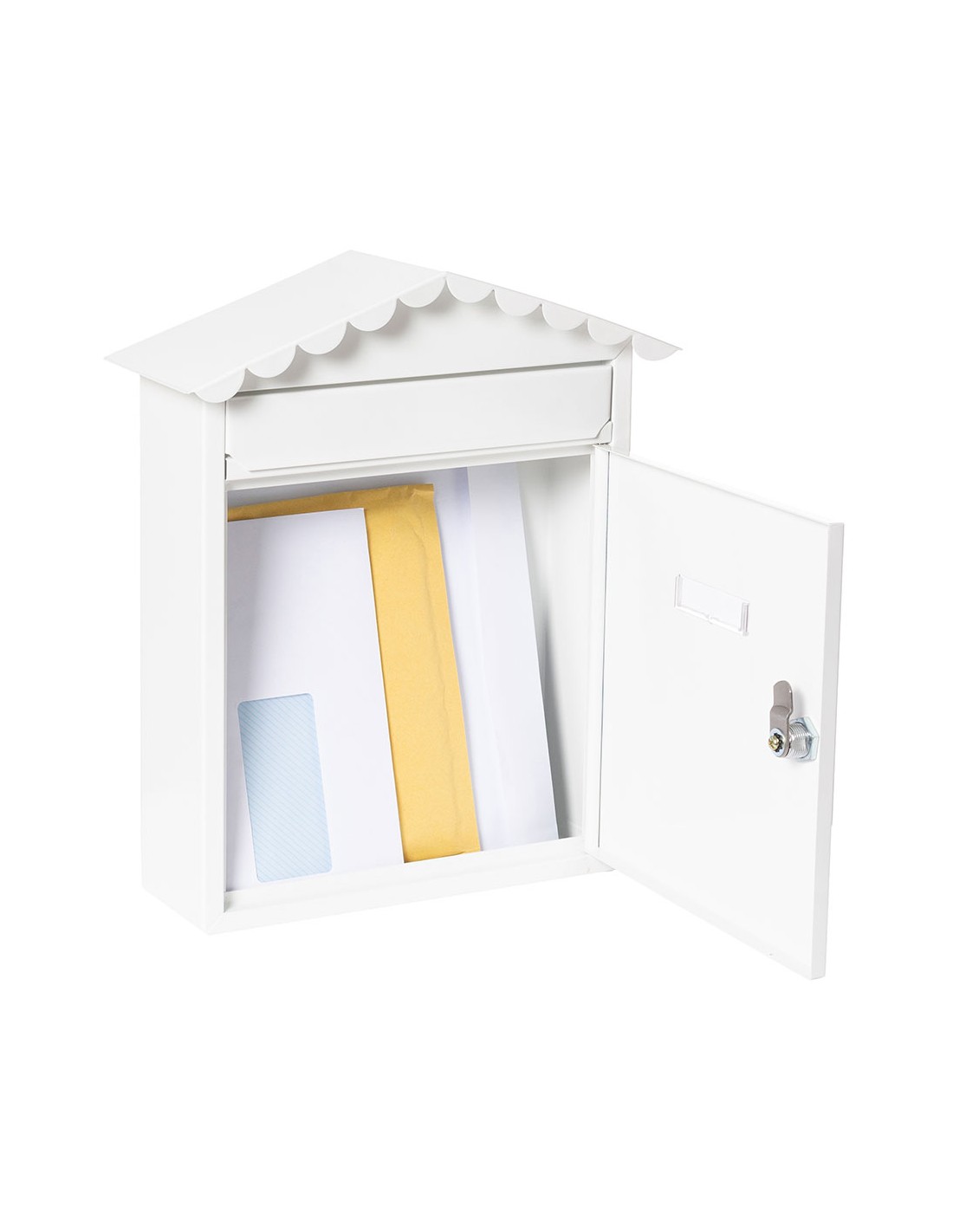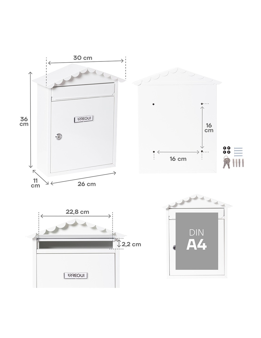 Buzón individual para exterior tamaño m (a4), fabricado en acero galvanizado lacado en blanco, con tejadillo decorativo que repele el agua de la lluvia apertura de puerta lateral incluye tarjetero, dos llaves y tornillos resistente a los rayos uv medidas: boca 22,8 x 2,2 cm, exterior 30 x 11 x 36 cm