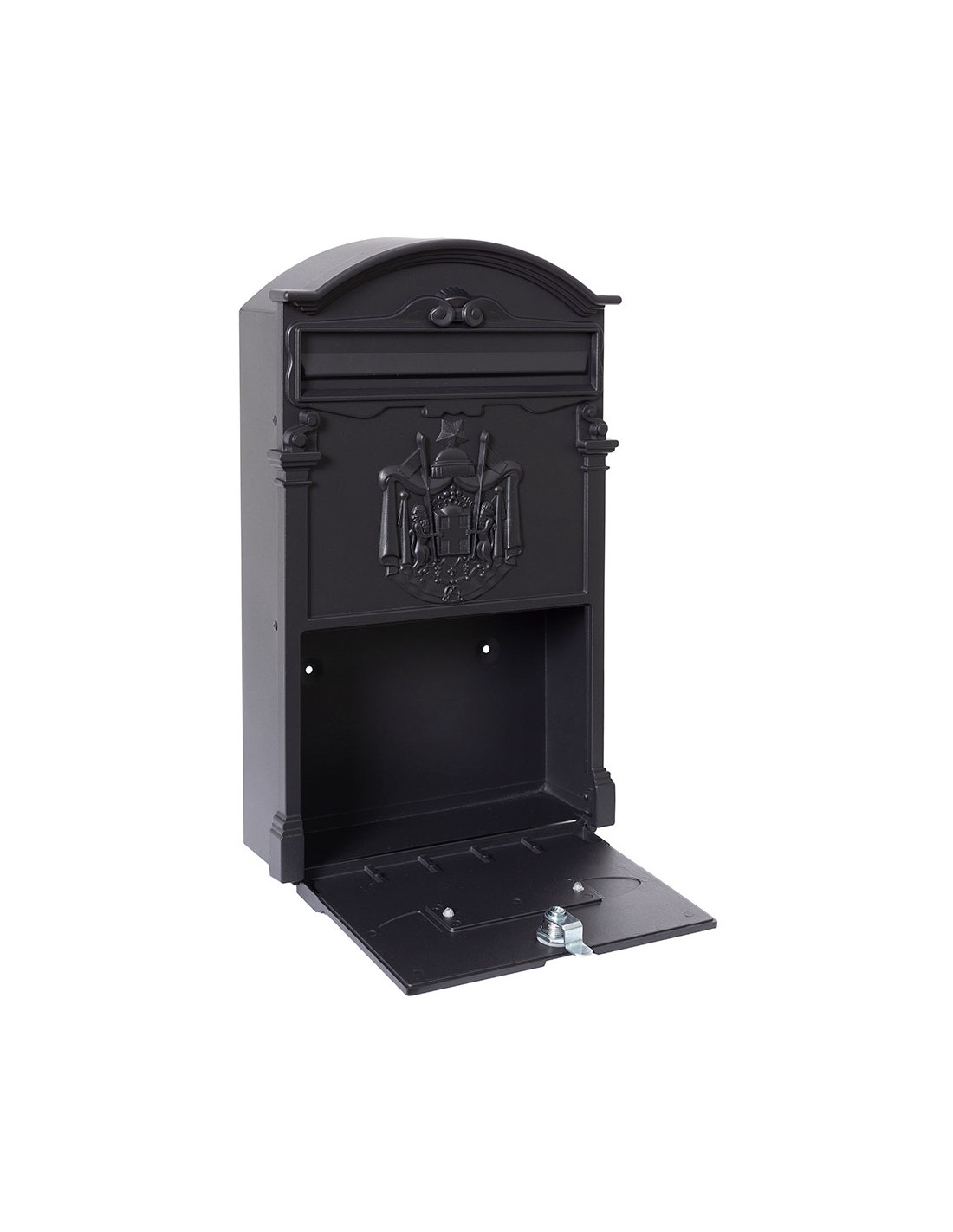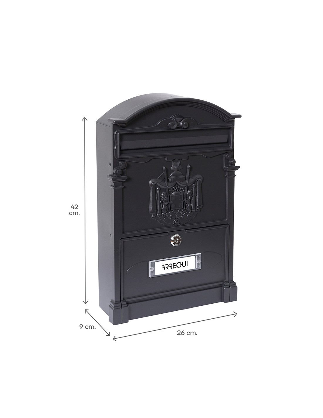 Buzón individual para exterior tamaño m (a4), cuerpo de aluminio y trasera de acero galvanizado, lacado negro boca con muelle para que esté siempre cerrada, símbolo heráldico frontal apertura de puerta vertical incluye tarjetero, dos llaves y tornillos resistente a los rayos uv medidas: boca 22 x 3,5 cm, exterior 26 x 9 x 42 cm