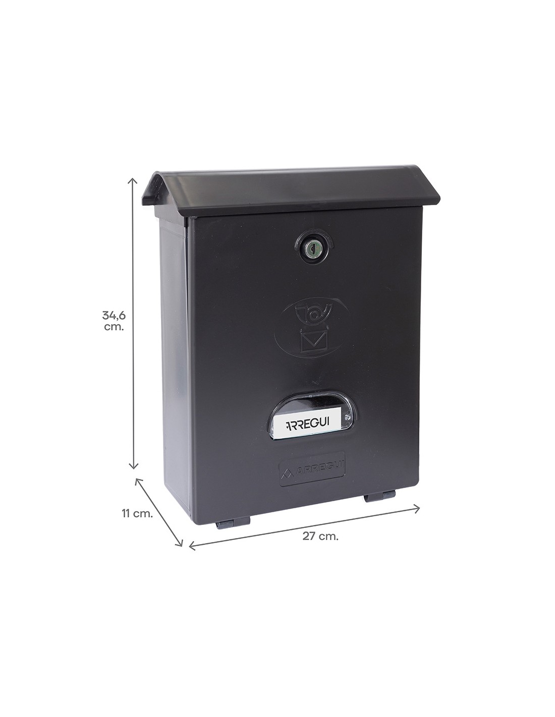 Buzón individual para exterior tamaño m (a4), fabricado en plástico poliestireno negro tapa superior que oculta la boca y la protege del agua, ideal para zonas costeras o muy húmedas apertura de puerta vertical incluye tarjetero, dos llaves y tornillos resistente a los rayos uv medidas: boca 20 x 2,5 cm, exterior 27 x 11 x 34,6 cm