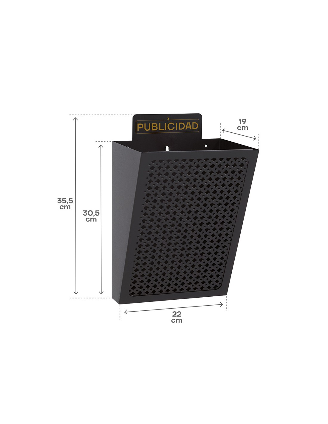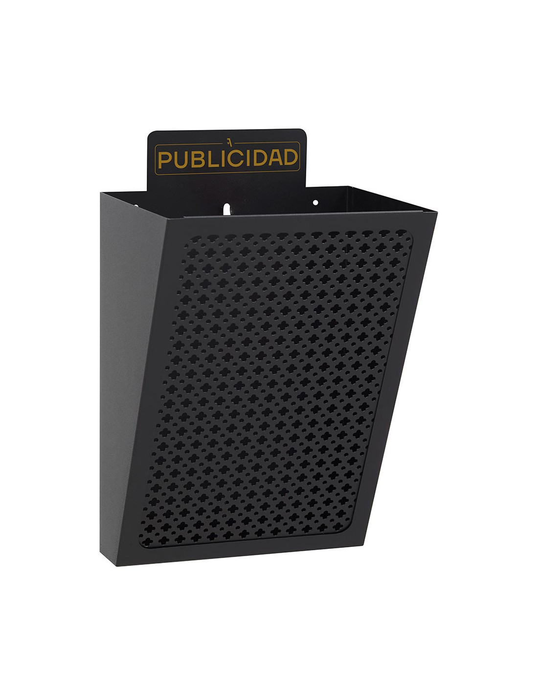 Cesta de publicidad modelo clásico, acero, negra, para colocar en la entrada de los edificios o en el exterior de los portales para recogida de publicidad en el exterior, rejilla frontal, total visibilidad interior, capacidad 7,5 l medidas: 22 x 19 x 35,5 cm