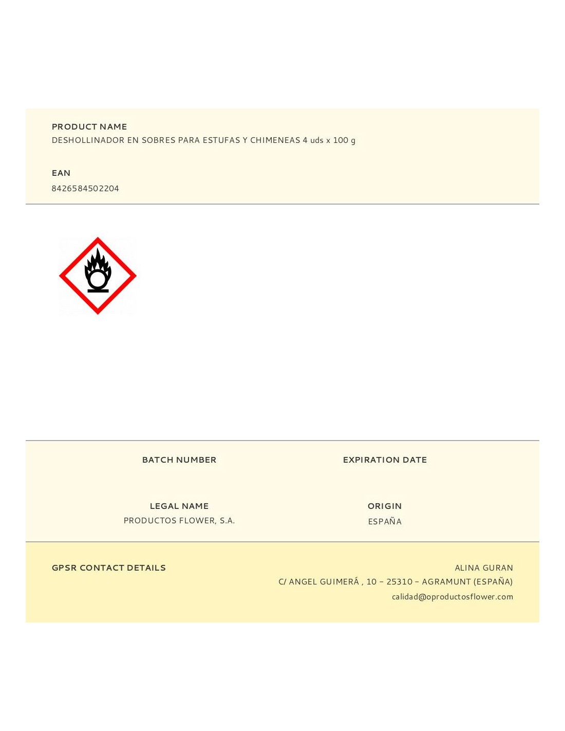 Deshollinador en sobres para estufas y chimeneas. previene y elimina la acumulación de hollín, resinas, grasas e incrustaciones en chimeneas y estufas. usado regularmente ayuda a mantener limpio el tubo, evitando posibles atascos e incendios en las chimeneas. mantener las instalaciones limpias supone un ahorro de un 25 a un 30% de combustible. contiene 4 sobres de 100 g