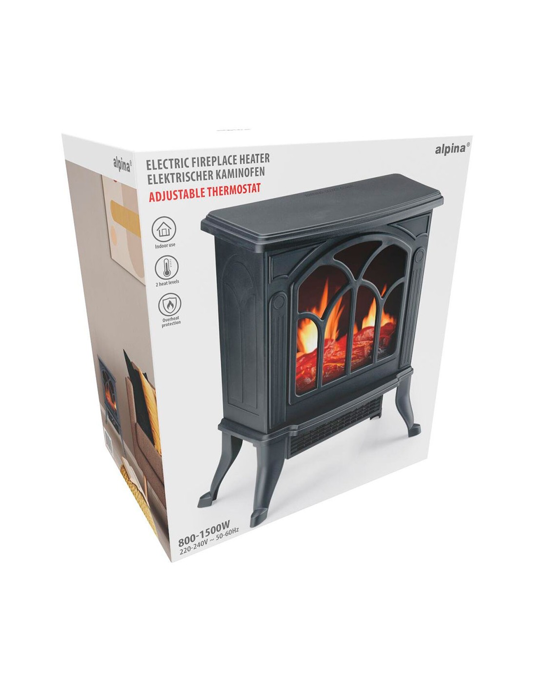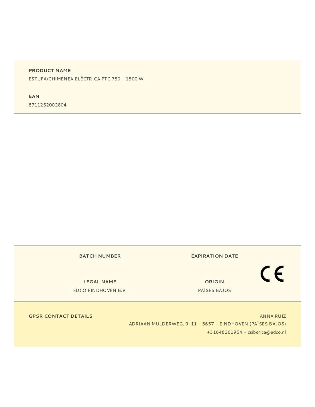 Calefactor eléctrico ptc tipo chimenea. potencia regulable en dos niveles: 800 w / 1500 w. alimentación: 220-240 v~ 50/60 hz. efecto llama realista para un ambiente acogedor. termostato ajustable.interruptor de encendido/apagado (alimentación principal y llama simulada - sin calor). fusible de seguridad interno. protección contra sobrecalentamiento. sistema de apagado automático en caso de vuelco (tip-over switch). apto para espacios hasta 25 m². diseño compacto y ligero. cable de 1,5 m dimensiones: 37,3 x 23 x 44 cm