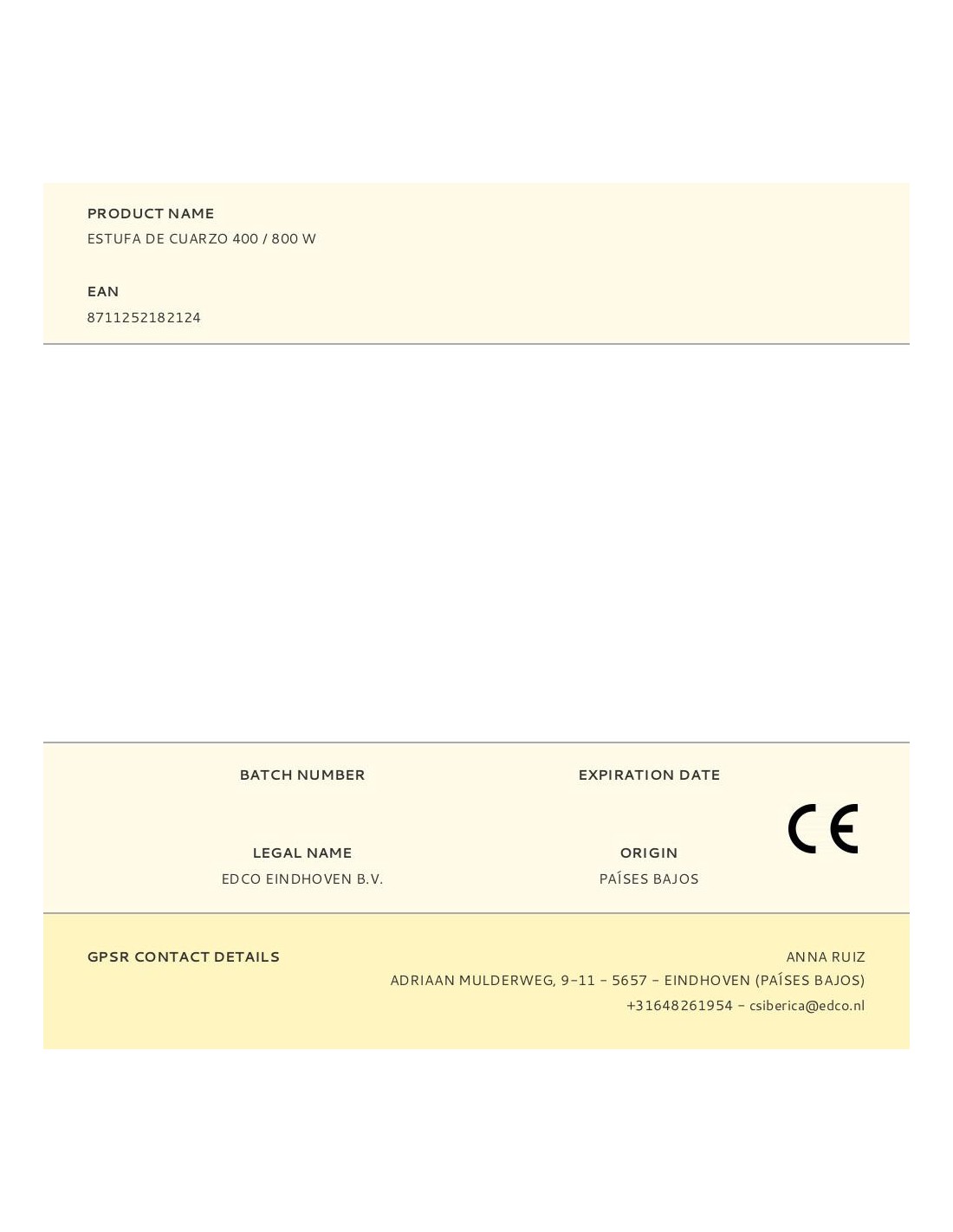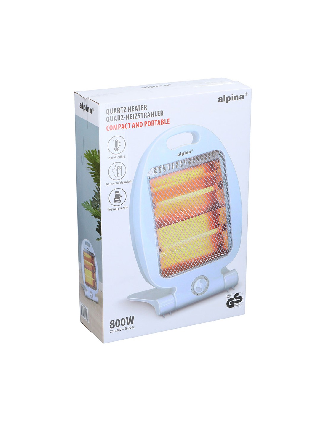 Estufa de cuarzo con 2 niveles de calor: 400 / 800 w. dispone de 2 tubos para calor instantáneo, 220 - 240 v ~ 50 - 60 hz, con asa para transporte e interruptor de seguridad antivuelco, medidas: 24 x 6 x 38 cm