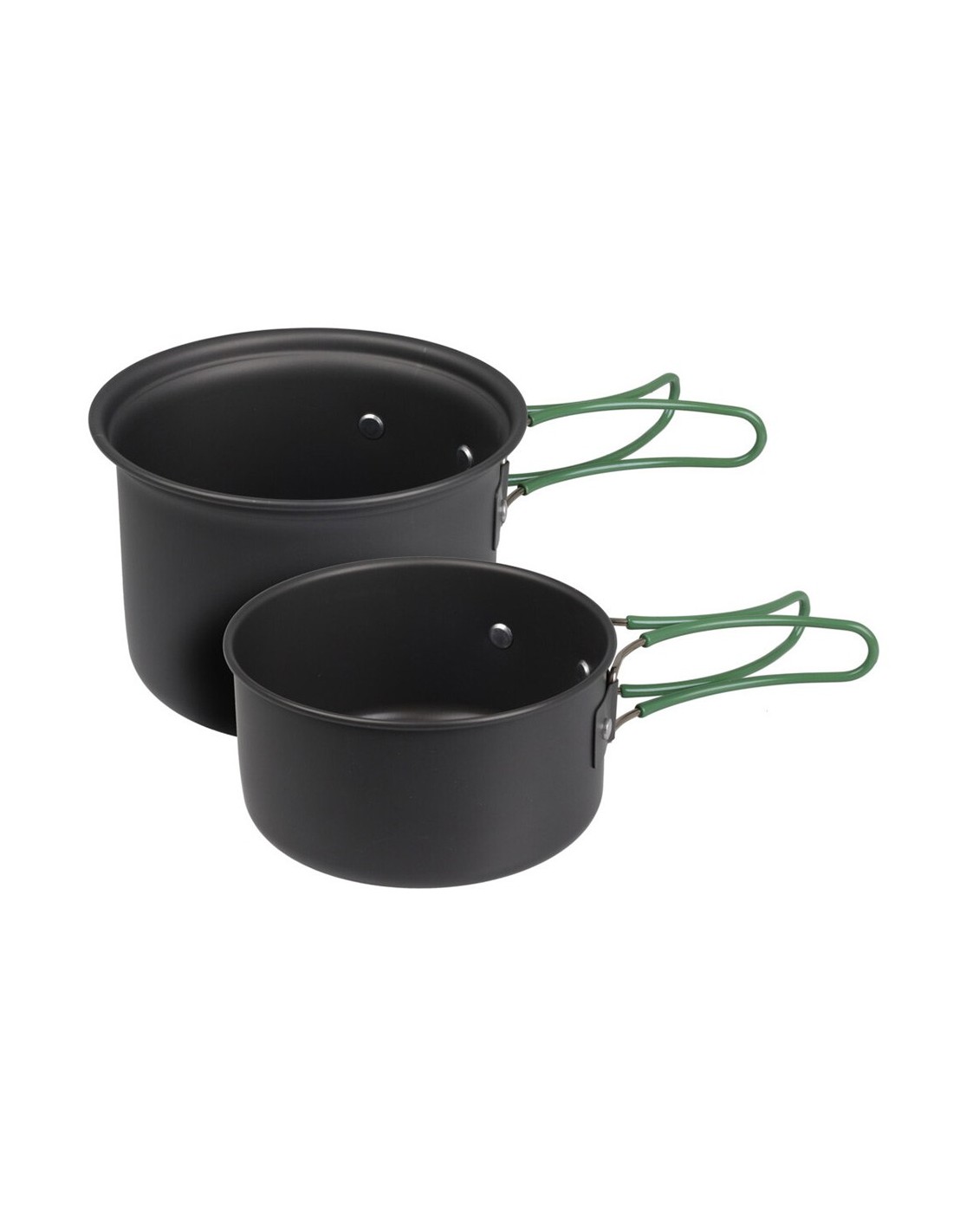 Cacerolas de aluminio anodizado con asas de acero inoxidable. incluye 2 piezas: 1 cacerola ø13 x 9 cm - 950 ml, 1 cacerola ø12 x 6 cm - 550 ml con asas plegables en color verde y una bolsa negra para su almacenamiento