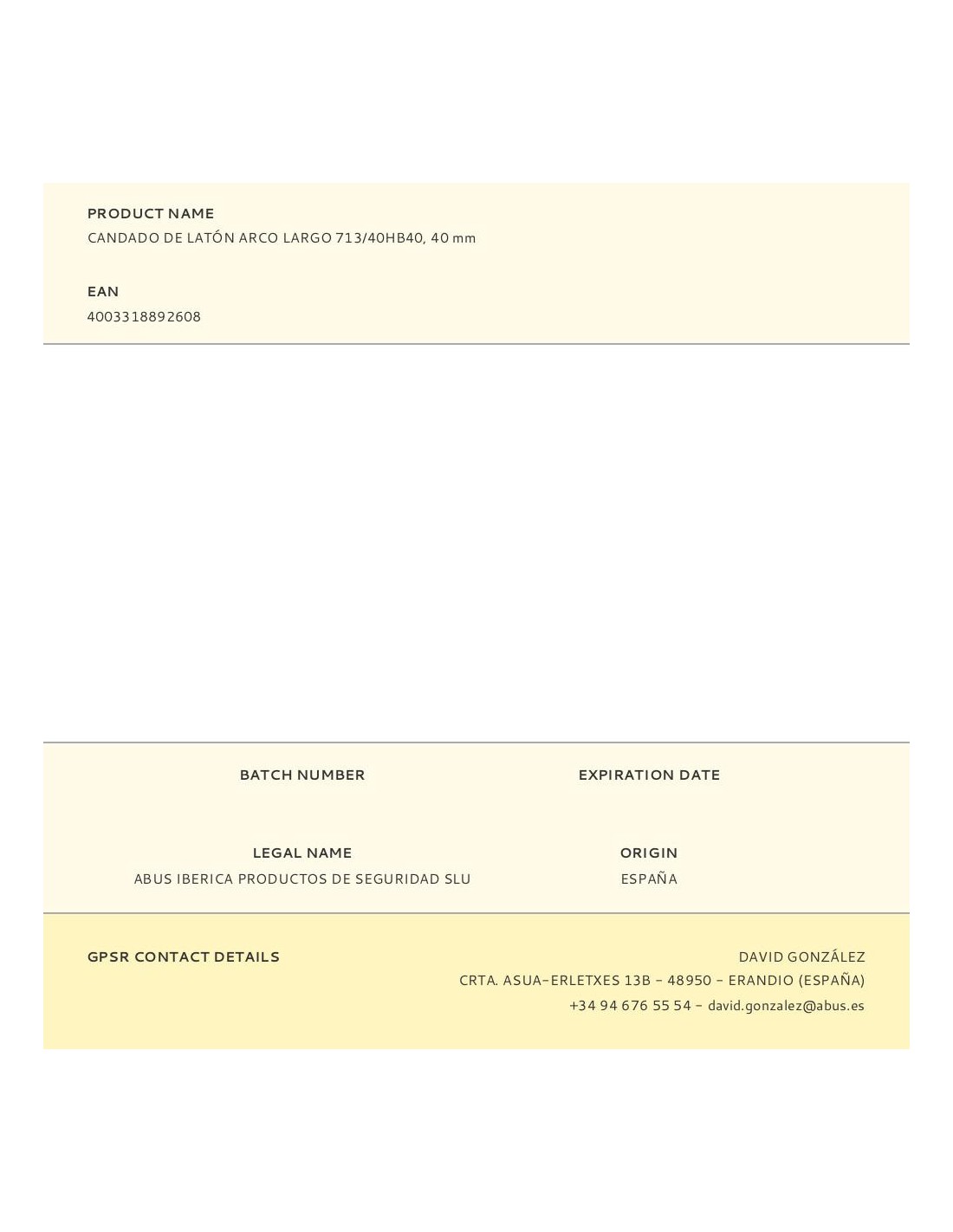Candado latón de arco largo 713/40hb40 con 2 llaves incluidas. medida candado 39,5 x 30 mm medida arco 20,5 x 39,5 mm, grossor ø6,5 mm