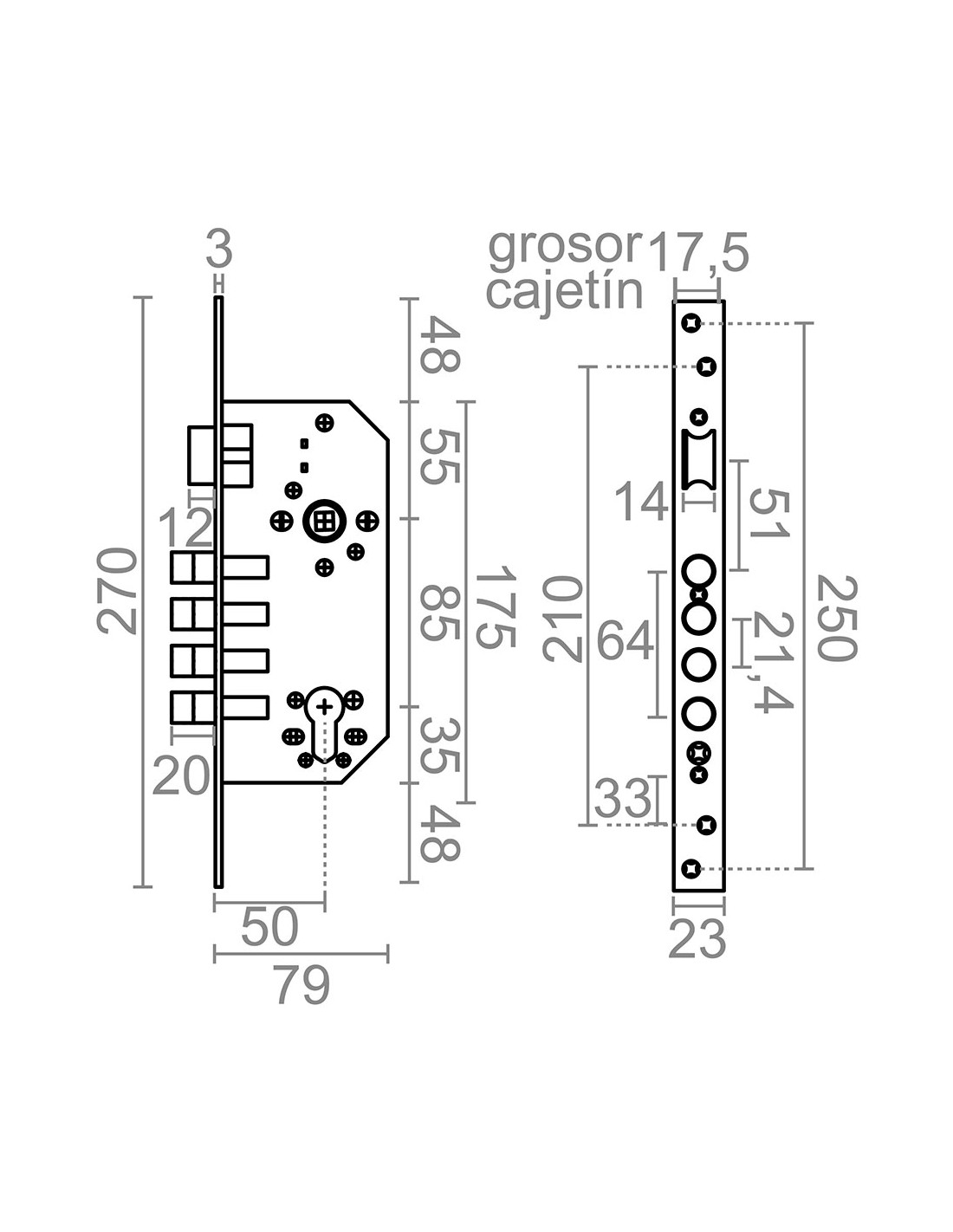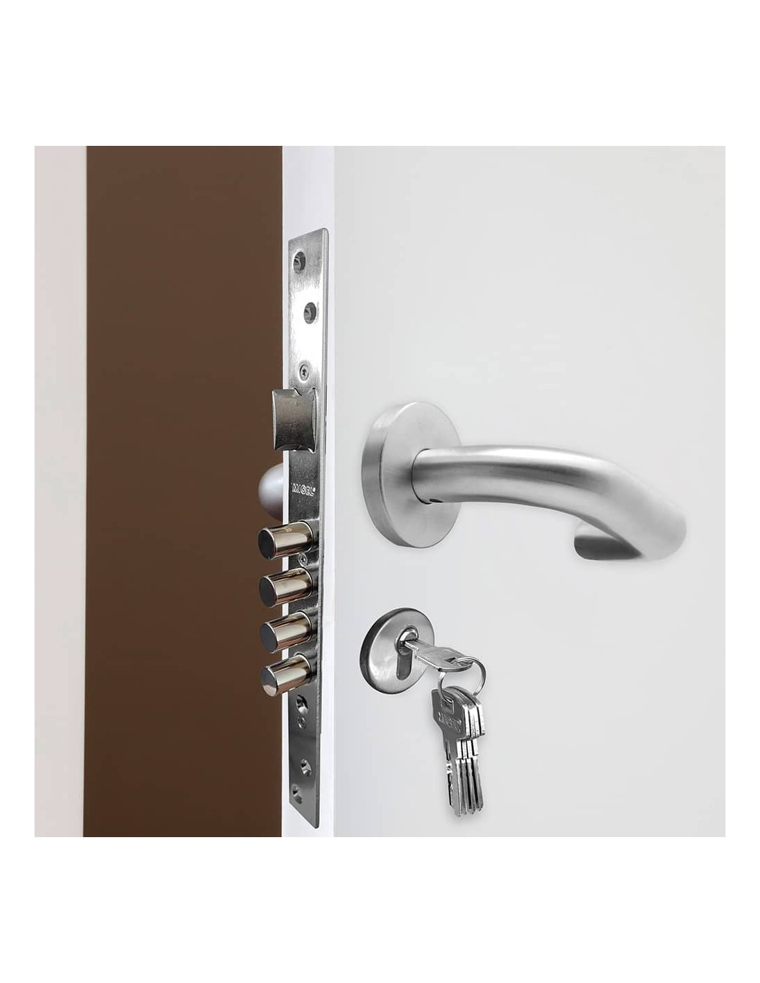 Cerradura embutir cre13 para cilindro de perfil europeo con leva larga (l15) para instalar en puertas de carpintería de madera, con canto cuadrado, resbalón reversible y nueca para cuadradillo de 8 mm esta cerradura tiene una distancia entre ejes de 85 mm y viene preparada con una entrada de 50 mm no incluye cilindro con 4 bulones de cierre incluye cerradero y tornillería fabricada en acero, acabado en níquel satinado