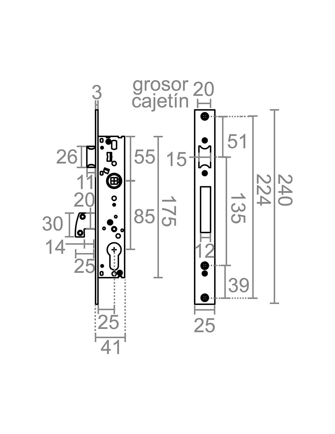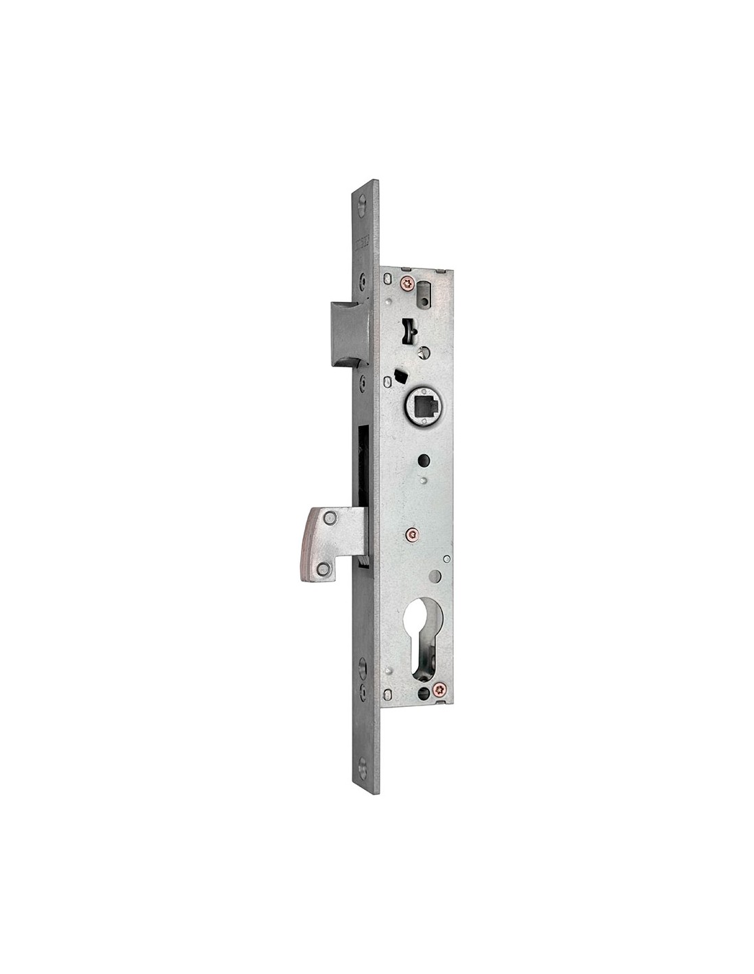 Cerradura embutir cre10 para cilindro de perfil europeo con leva larga (l15) para instalar en puertas de carpintería metálica con canto cuadrado, con gancho lámina, resbalón reversible y nueca para cuadradillo de 8 mm esta cerradura tiene una distancia entre ejes de 85 mm y viene preparada con una entrada de 25 mm no incluye cilindro incluye 2 protectores de escudo (plástico), cerradero y tornillería fabricada en acero inoxidable, acabado en inox