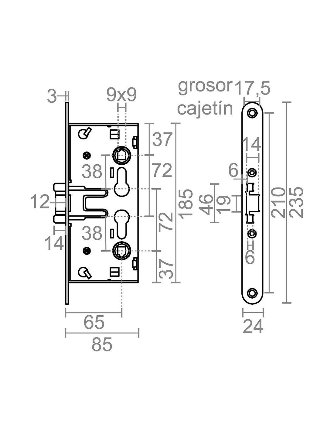 Cerradura embutir cortafuego cre09 para cilindro de perfil europeo con leva larga (l15) para instalar en puertas cortafuego con función antipánico, con canto redondo, doble nueca para cuadradillo de 9 mm y doble alojamiento de cilindro esta cerradura viene preparada con entrada 65 mm y distancia cilindro 72 mm (no incluye cilindro ni cuadradillo) fabricada en hierro, acabado zincado