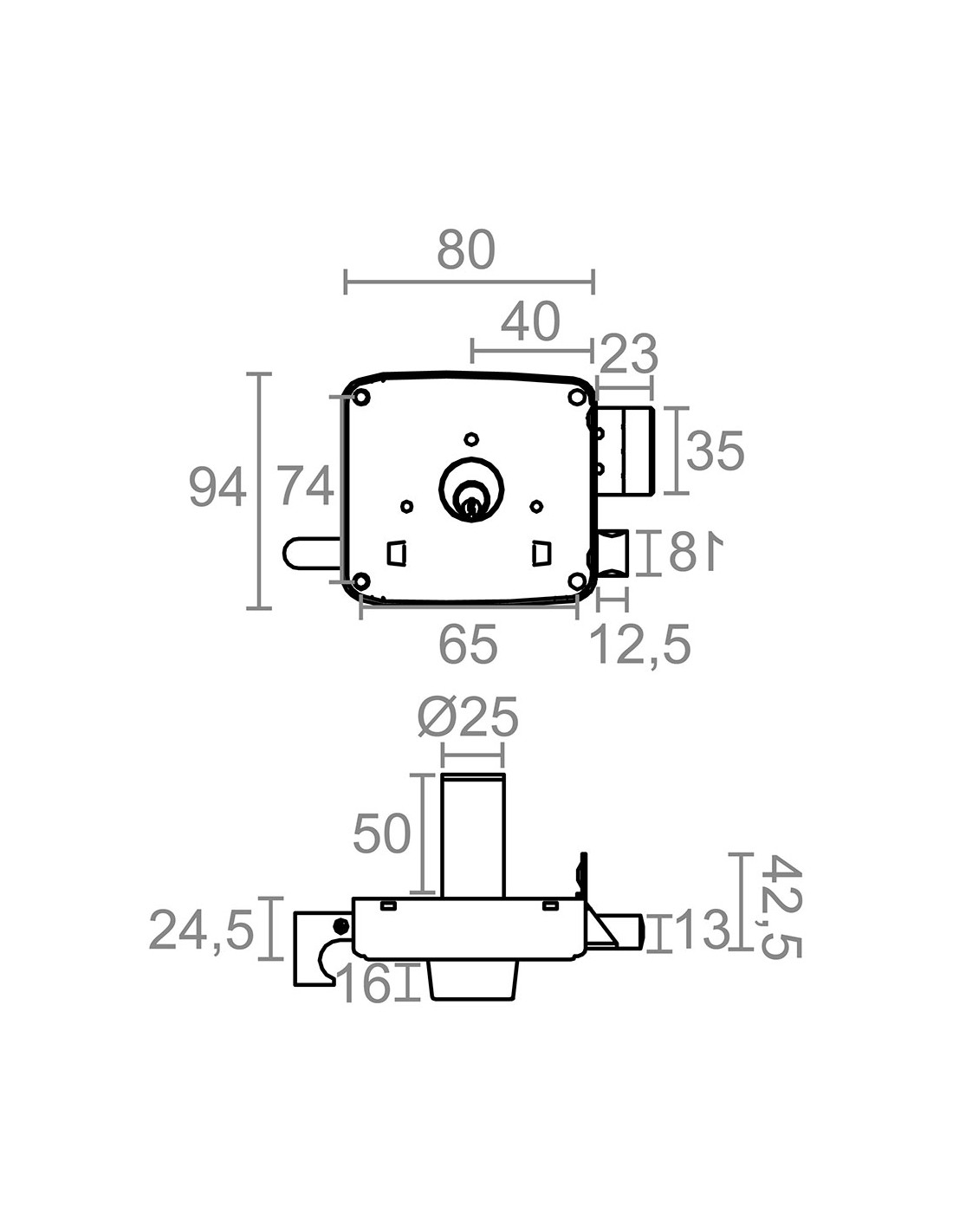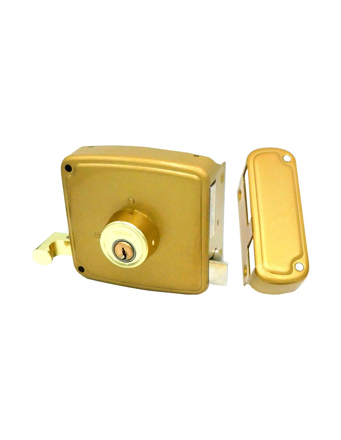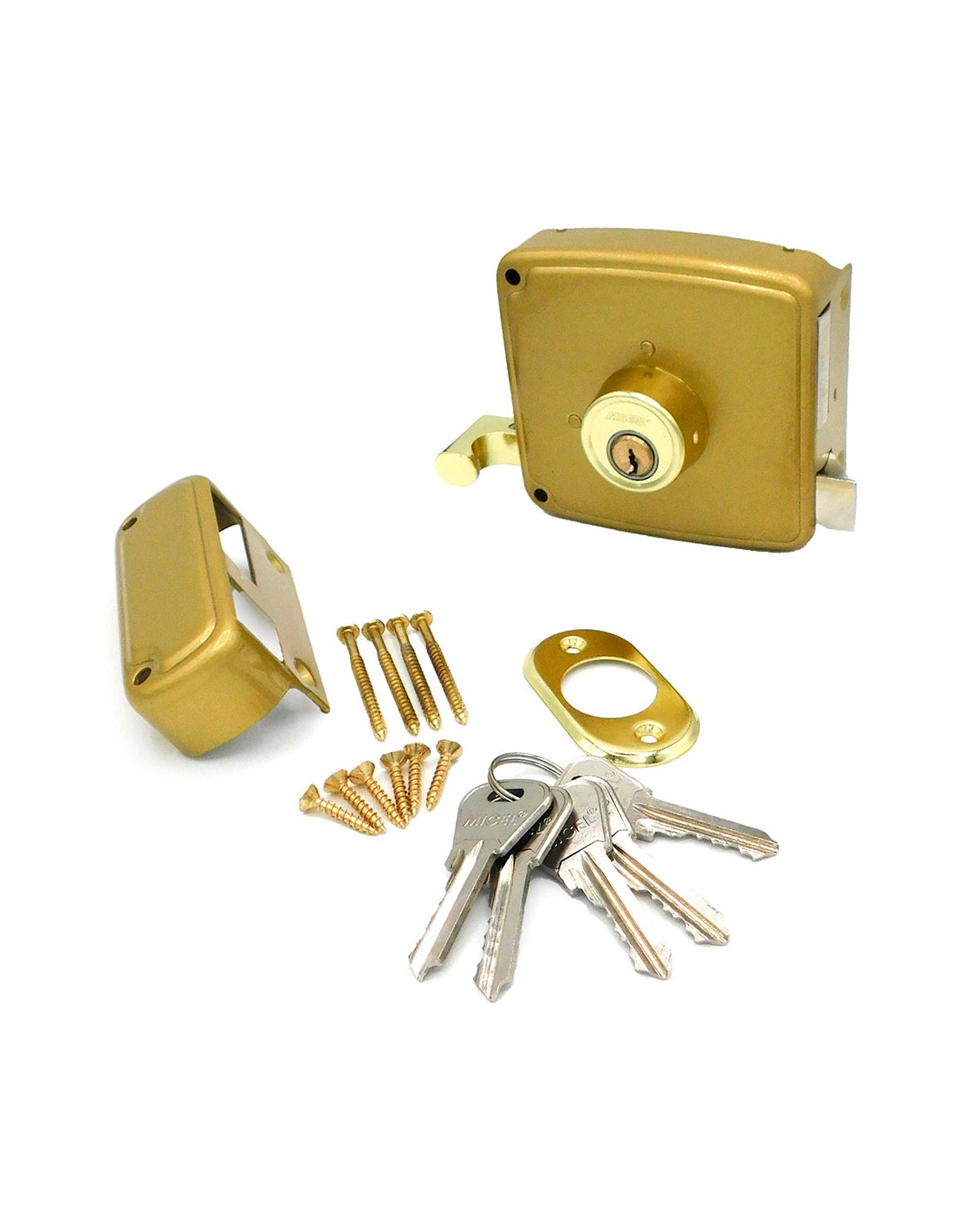 Cerradura sobreponer crs02 40 x 80 mm para instalar en puertas de carpintería de madera, reforzando la seguridad en la entrada del hogar u otras estancias como despachos, locales comerciales, etc. el cilindro que lleva es de forma redonda de 5 pines es de mano izquierda desplazamiento de 20 mm (2 vueltas) incluye palanca de cierre, lengüeta, tirador y 5 llaves tipo serreta la llave en bruto para copias adicionales es la referencia 10791 fabricada en acero, acabado pintado en oro