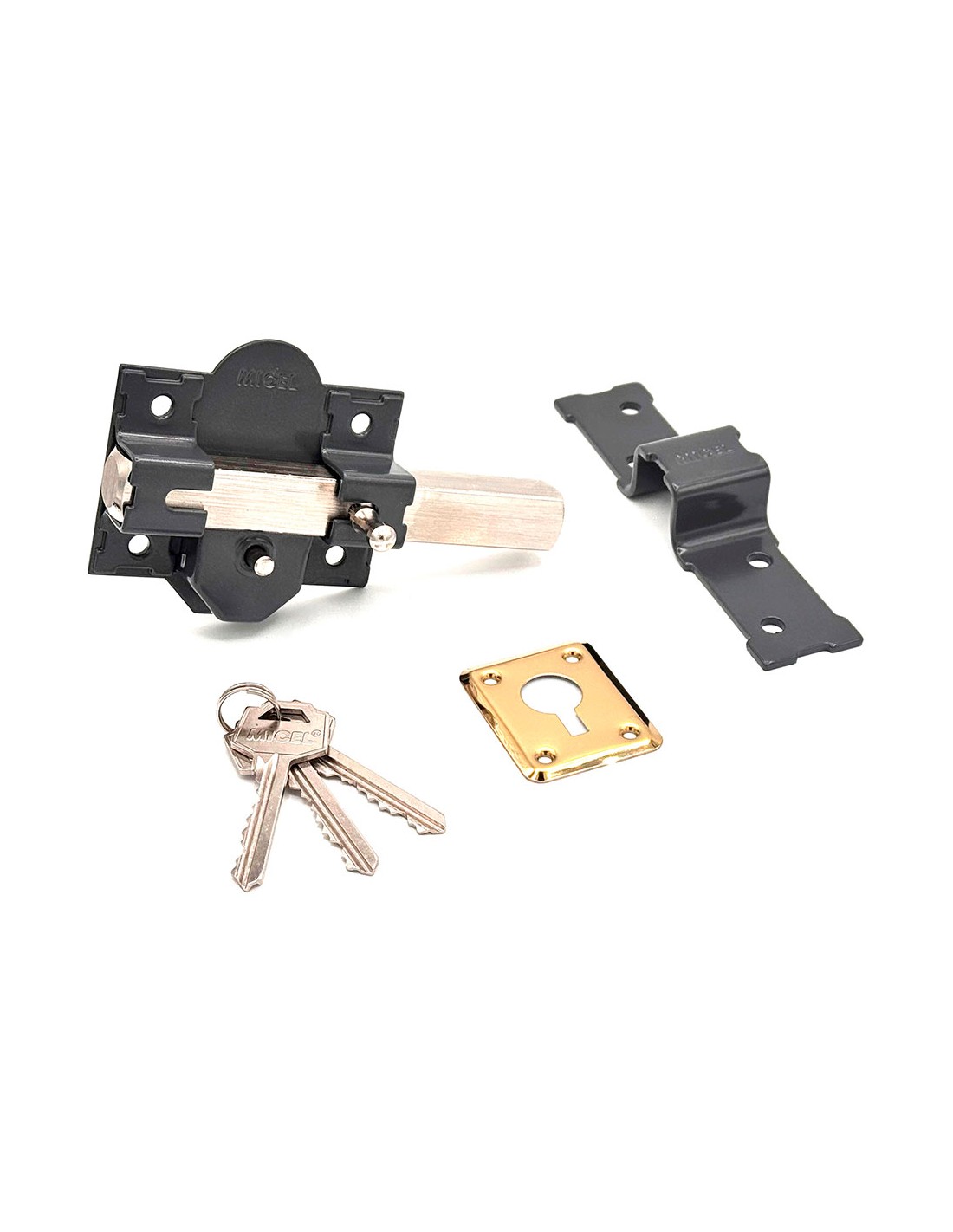 Cerrojo de sobreponer crr08 con placa de 86 mm y cilindro con boca pera de 70 mm para reforzar la seguridad mediante la instalación en cualquier tipo de puerta además, al ser reversible, no guarda mano el accionamiento interno se realiza mediante un botón, mientras que el exterior se realiza mediante llave a través del cilindro con 3 llaves de serreta fabricado en acero, acabado pintado en gris