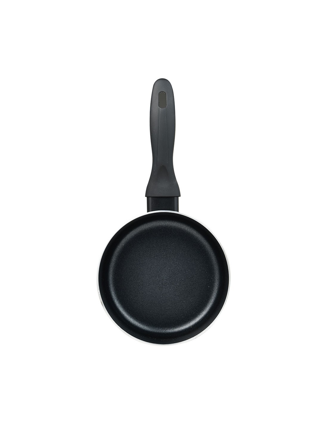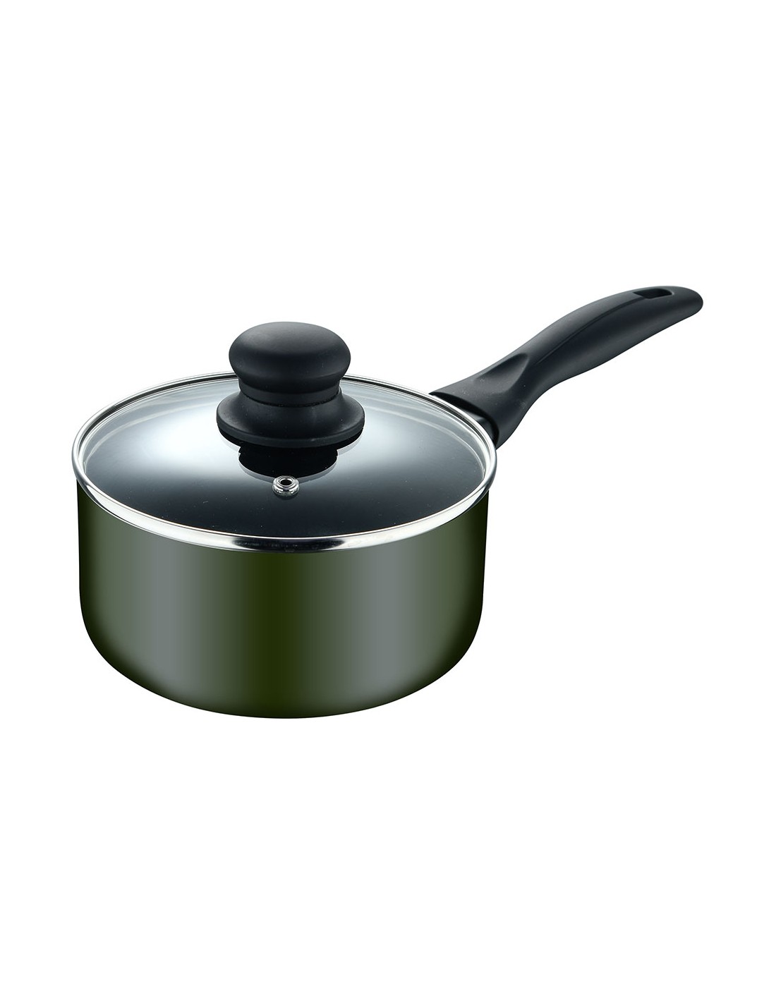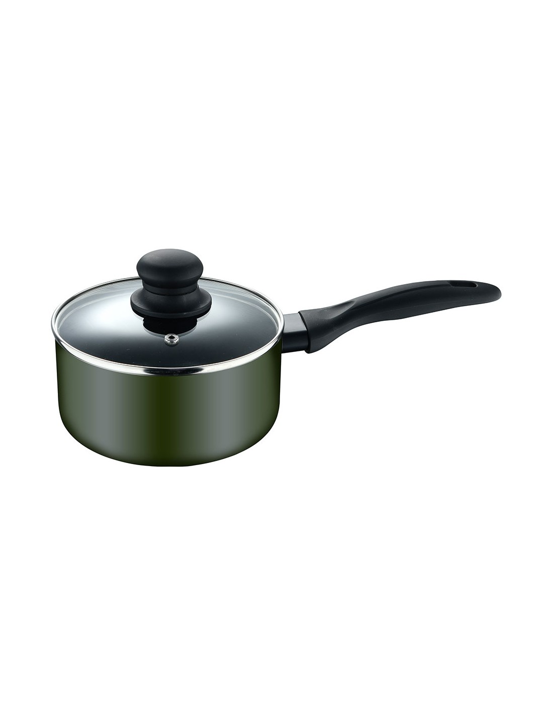 Cazo de aluminio prensado, con tapa de cristal, para inducción, acabado exterior verde, interior con revestimiento antiadherente negro, exterior resistente al calor en pq-7764c. asas negras resistente al calor y pomo con tacto suave. ø16 x 8 cm