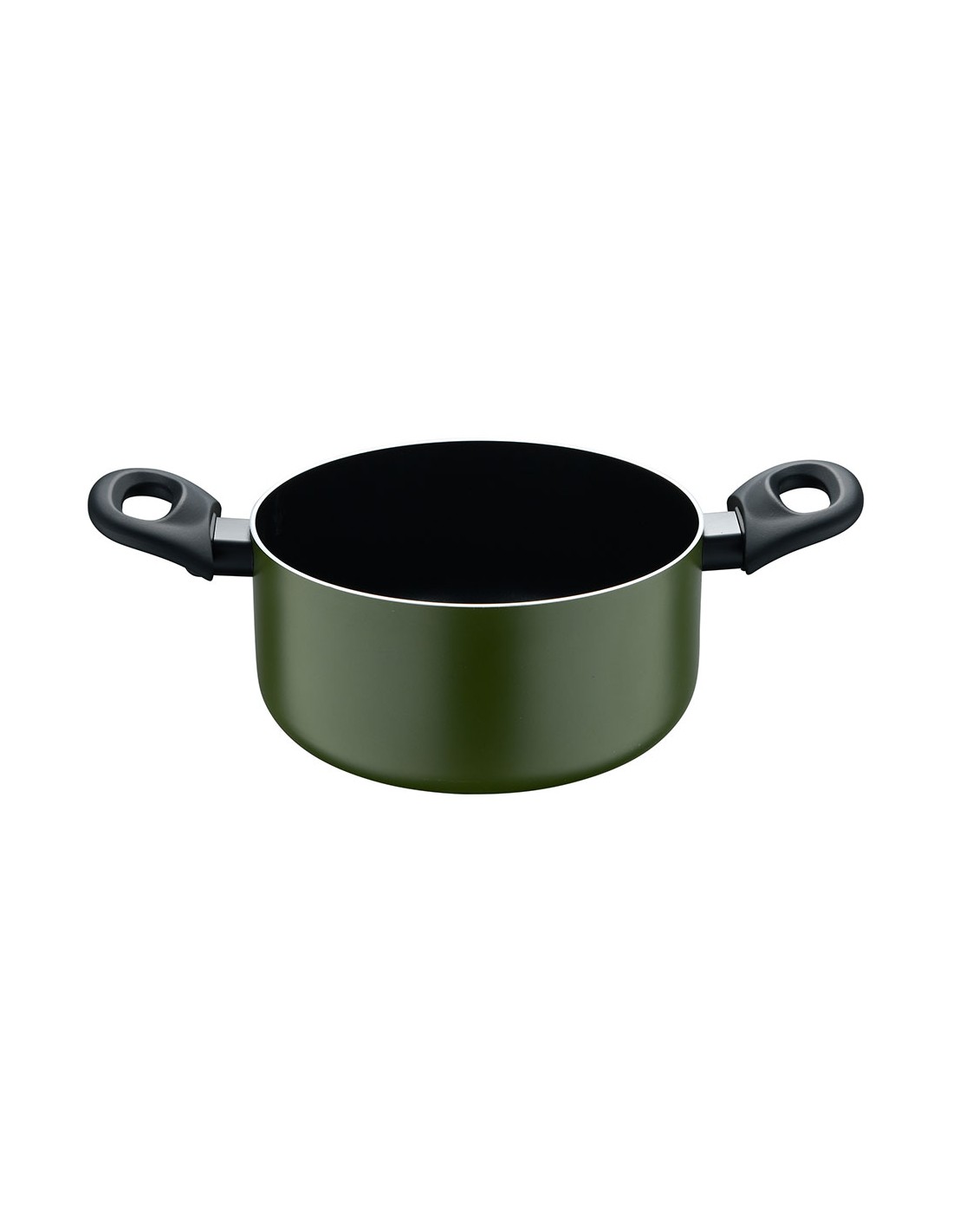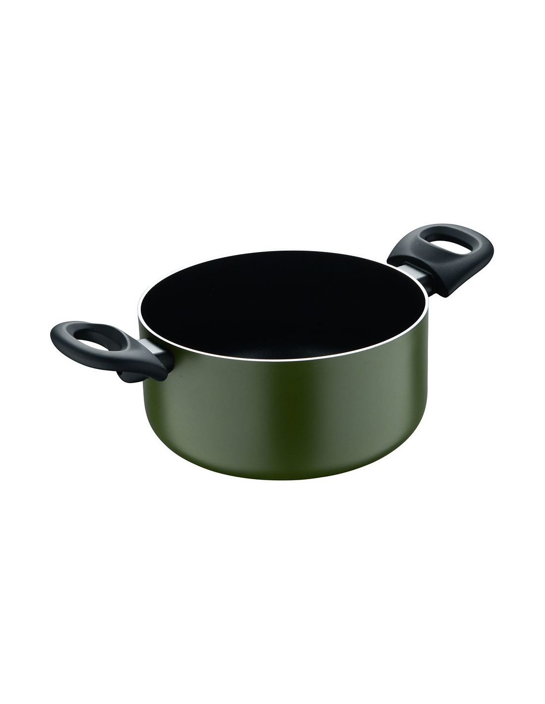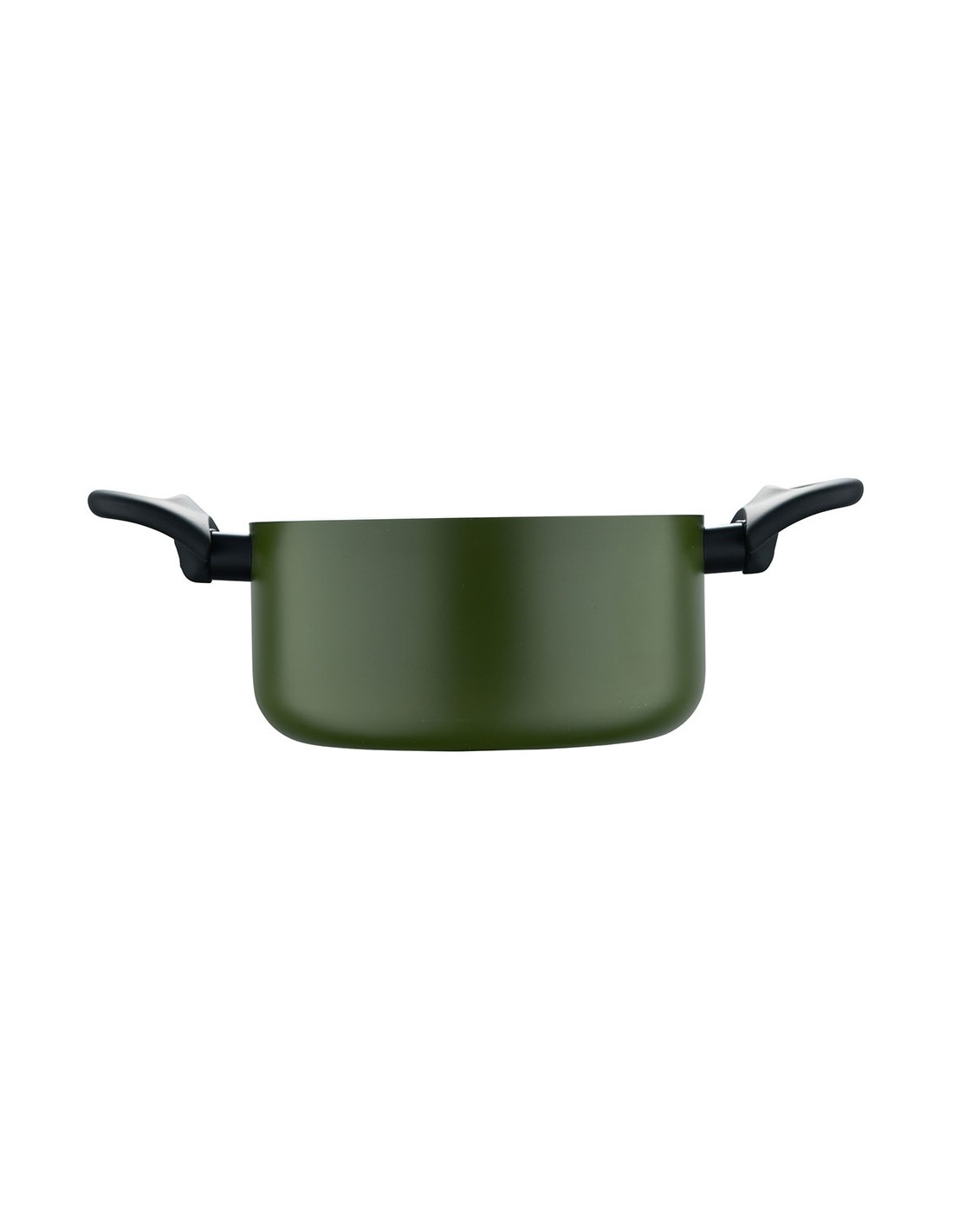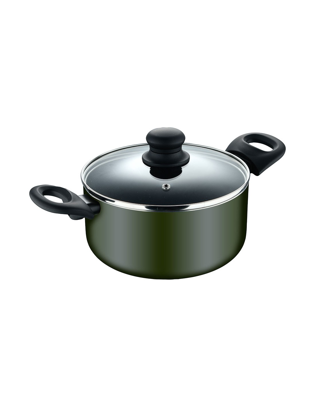 Cacerola de aluminio prensado, con tapa de cristal, para inducción, acabado exterior verde, interior con revestimiento antiadherente negro, exterior resistente al calor en pq-7764c. asas negras resistente al calor y pomo con tacto suave. ø20 x 10 cm