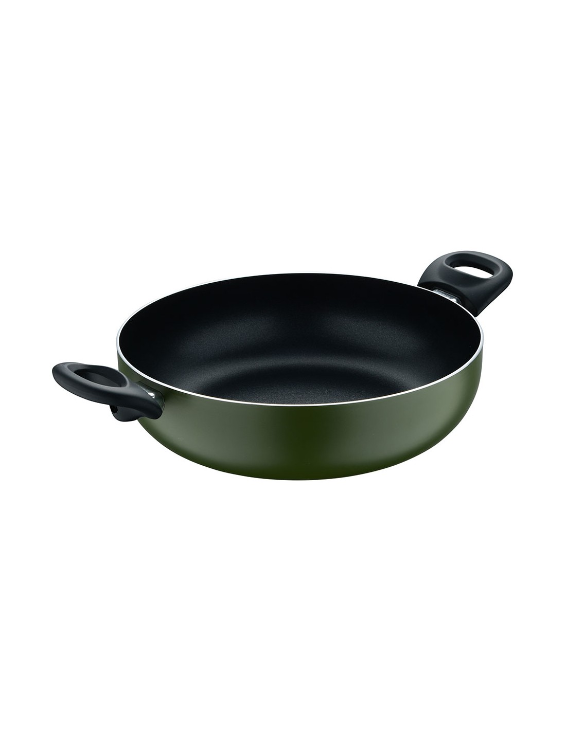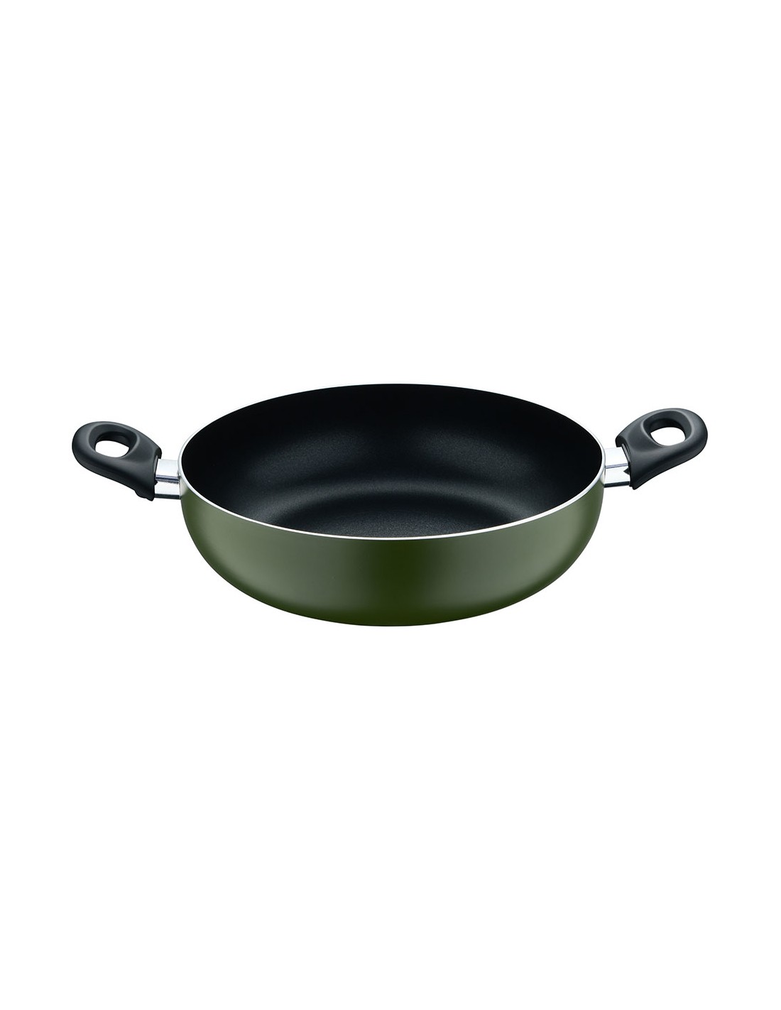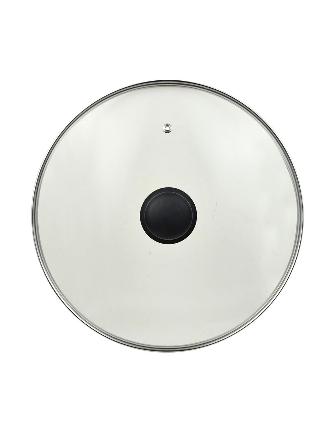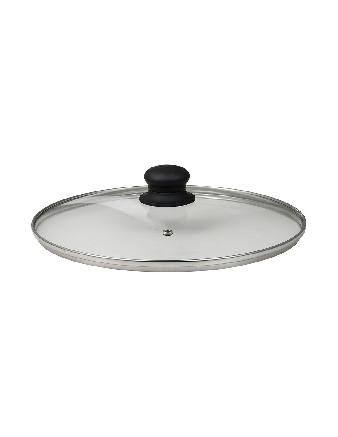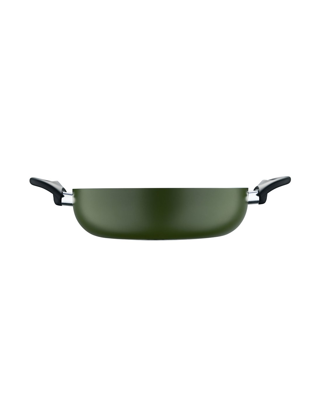 Cacerola baja de aluminio prensado, con tapa de cristal, para inducción, interior con revestimiento negro, exterior resistente al calor en pq-7764c. asas negras resistentes al calor y pomo con tacto suave. ø28 x 8 cm