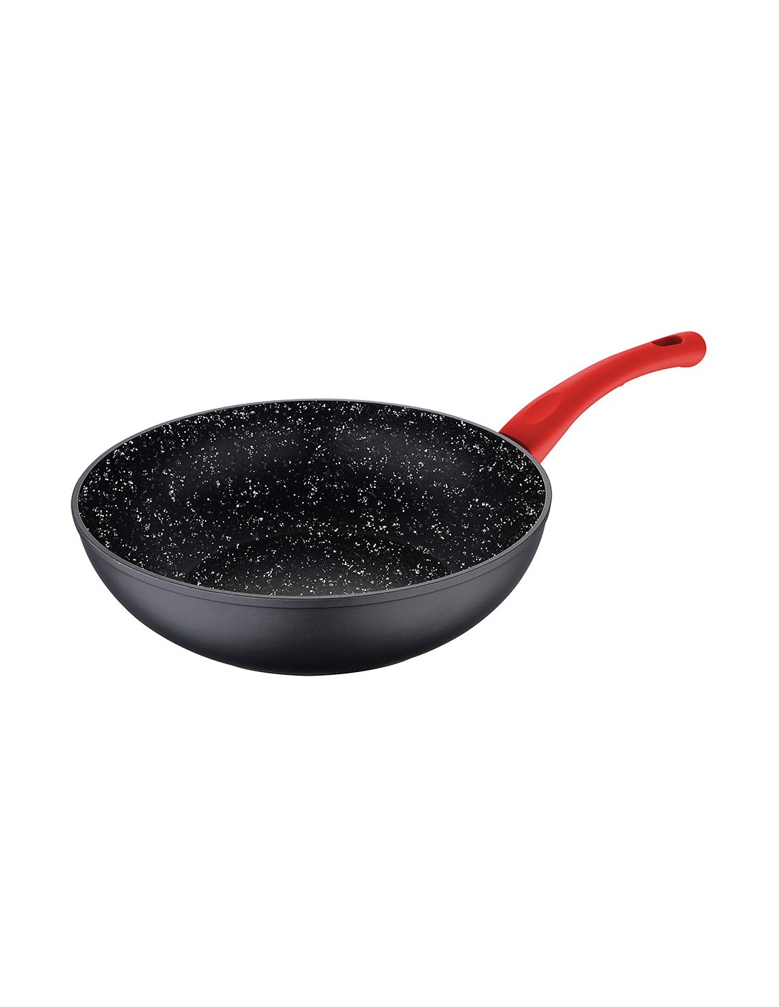 Wok de aluminio forjado ø20 cm, interior negro marmolado, exterior en negro. para inducción. mango de baquelita con tacto suave en color rojo
