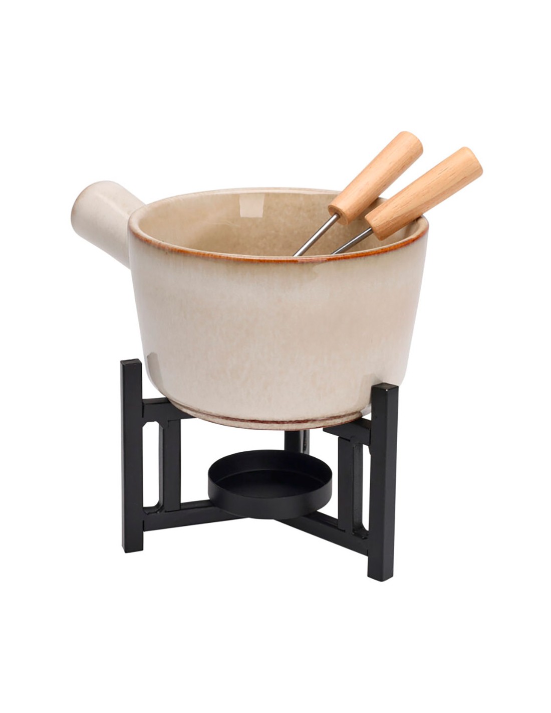 Fondue de porcelana, soporte metálico y 2 tenedores de acero inoxidable. medidas: cuenco 450 ml, ø12 x 7,5 cm con mango de 5 cm, soporte para vela: ø5 cm, soporte ø12 x 8 cm y 2 tenedores de 15 cm