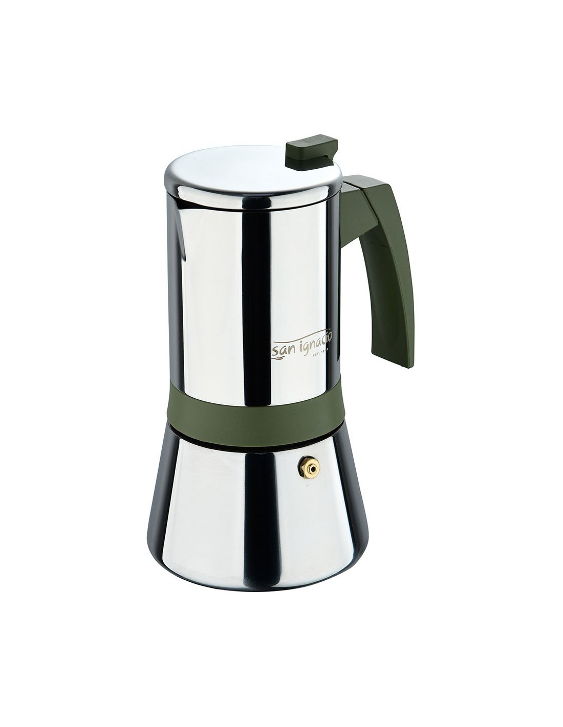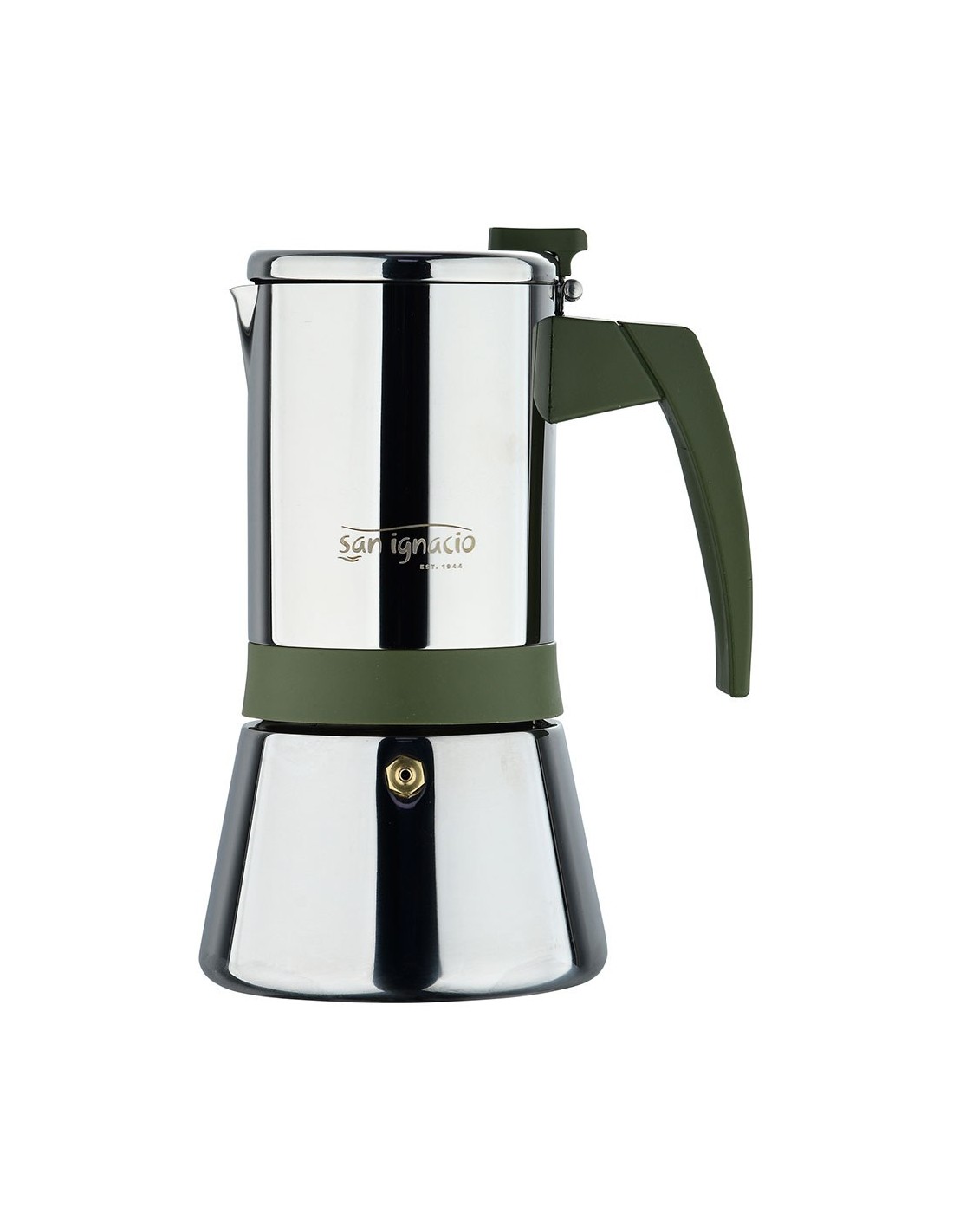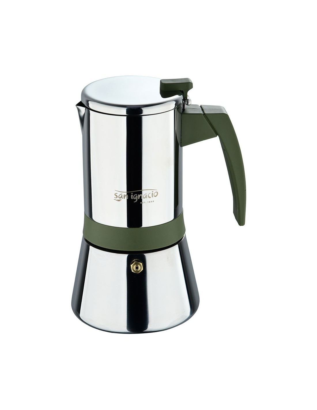 Cafetera de acero inoxidable, serie experto, 6 tazas, 300 ml. apta para inducción. pared simple con asa de nylon color verde oliva y parte central con envoltura de silicona en pq-7764c. ø10,5 x 19 cm