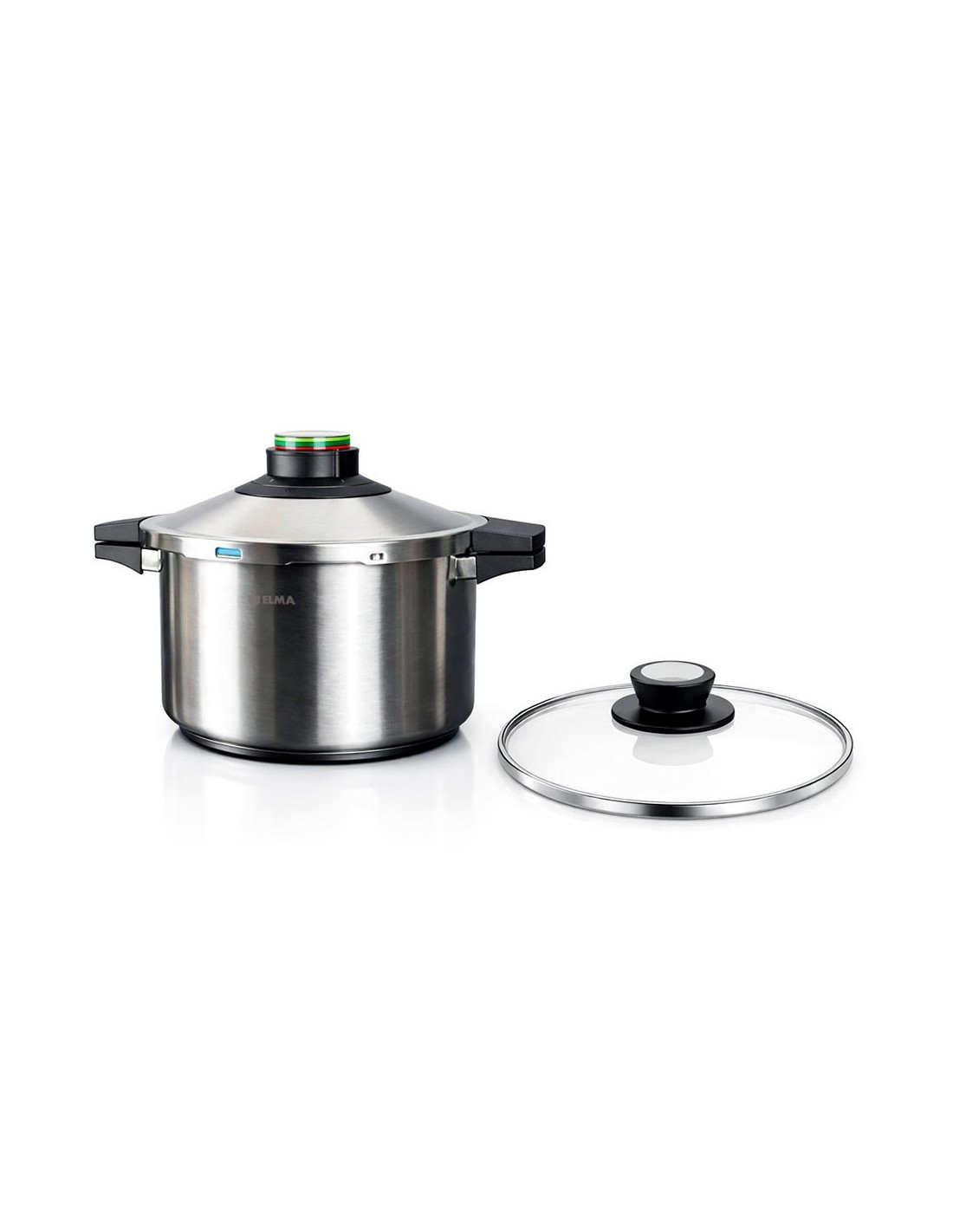 Olla a presión prêst 6 l, de acero inoxidable 18/10 de gran espesor, con triple sistema de seguridad, válvula indicadora de 3 colores para un control preciso y válvula con 2 posiciones de cocinado (nivel i: 0,85 bar / nivel ii: 1,05 bar) más una de descompresión para una liberación de vapor controlada, fondo difusor encapsulado con diámetro amplio (24 cm) para una óptima distribución del calor, asas con inserto metálico para un ajuste duradero y diseño de doble asa, junta de silicona de 24 cm. apta para todo tipo de cocinas: inducción, gas, vitrocerámica y eléctrica. incluye tapa de presión de ø24 cm y tapa de cristal