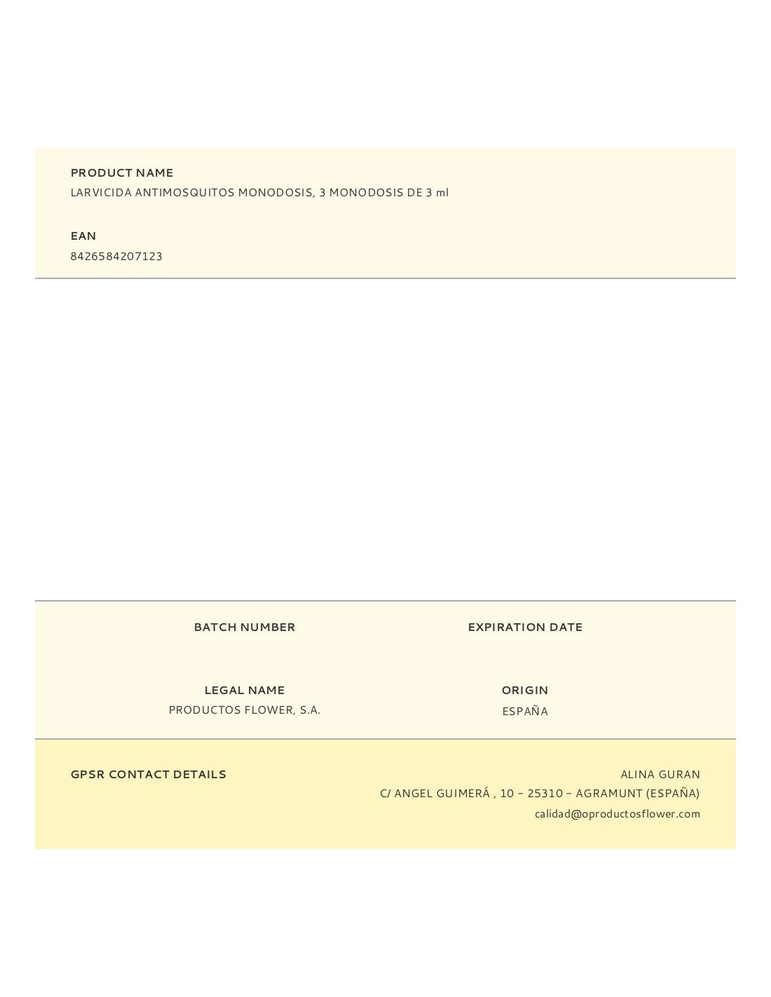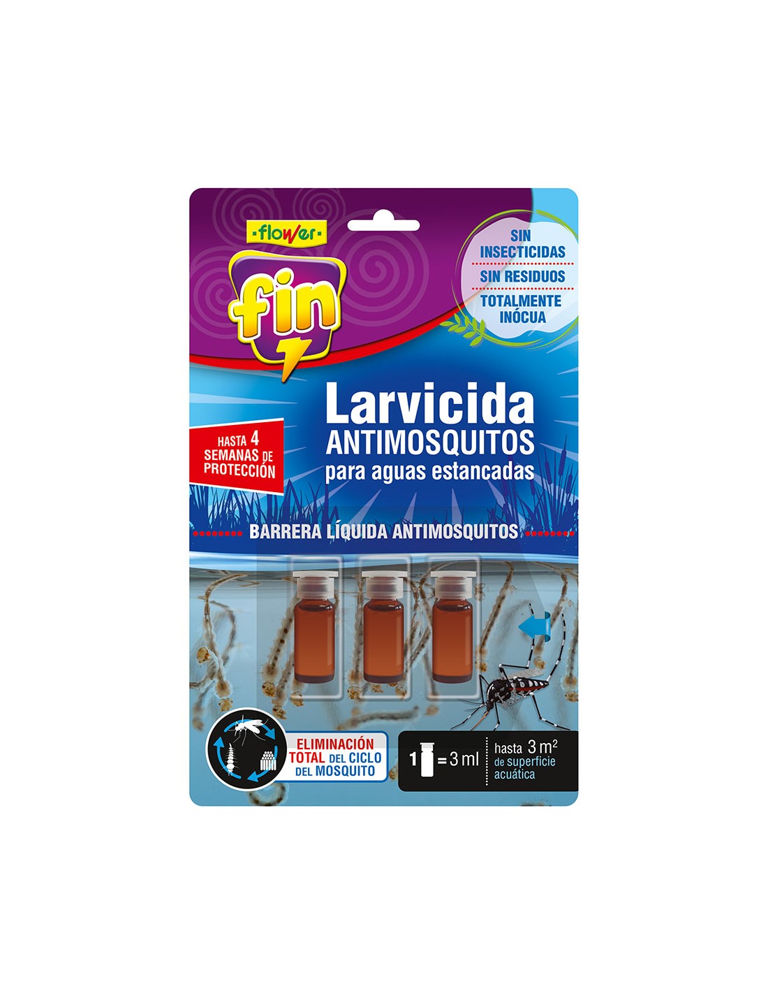 Larvicida antimosquitos monodosis que actúa formando una película sobre la superficie del agua, bloqueando el desarrollo de los mosquitos. no contiene ingredientes tóxicos ni químicos biocidas. es seguro para mascotas, plantas, aves y peces. compatible con agua potable. inocuo para personas y animales. biodegradable de forma natural a las 4 semanas, 1 monodosis tratamiento hasta 3 m², 3 monodosis de 3 ml