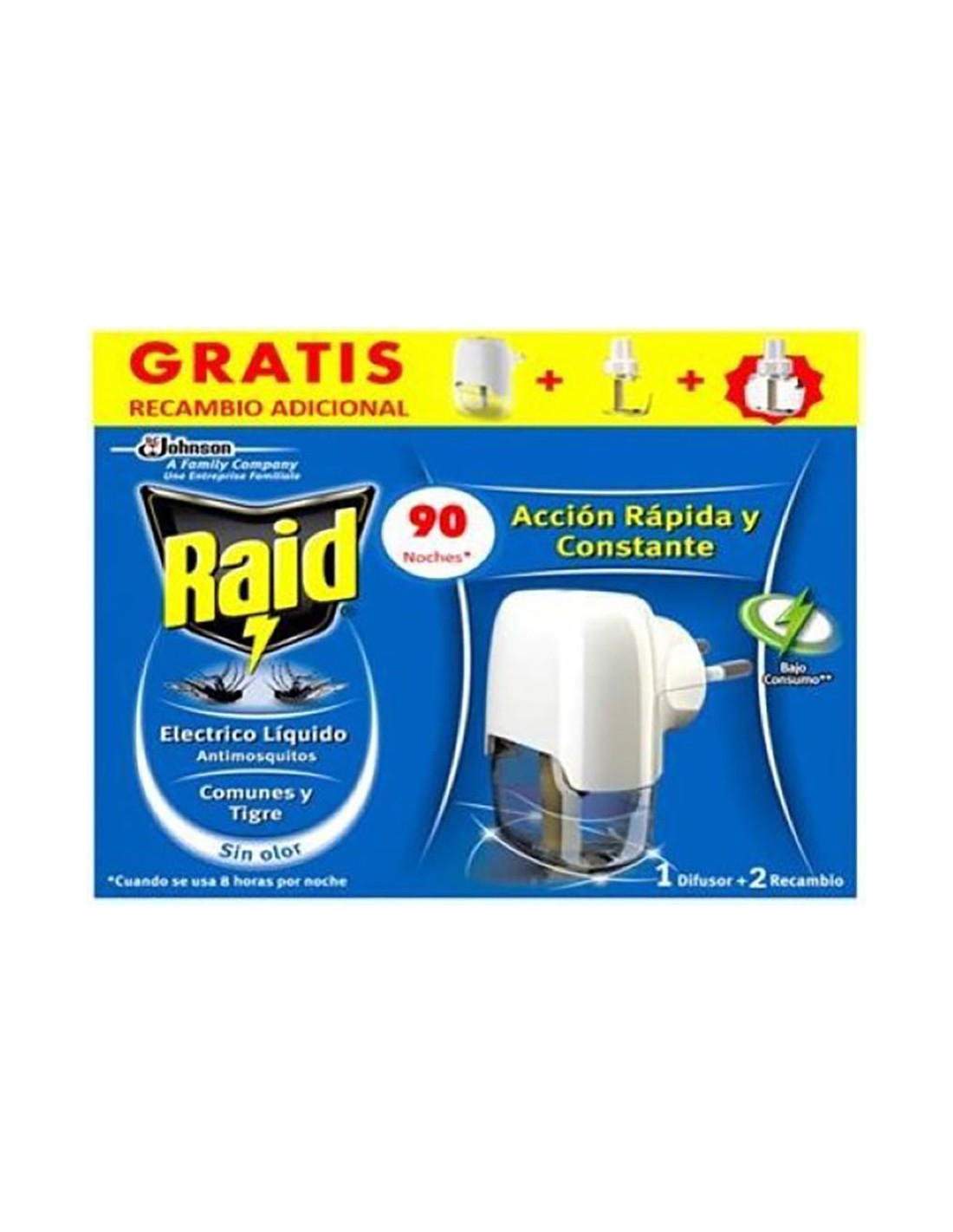 Insecticida eléctrico diseñado para combatir mosquitos tigre y común. incluye un aparato difusor y dos recambios líquidos, ofreciendo hasta 90 noches de protección