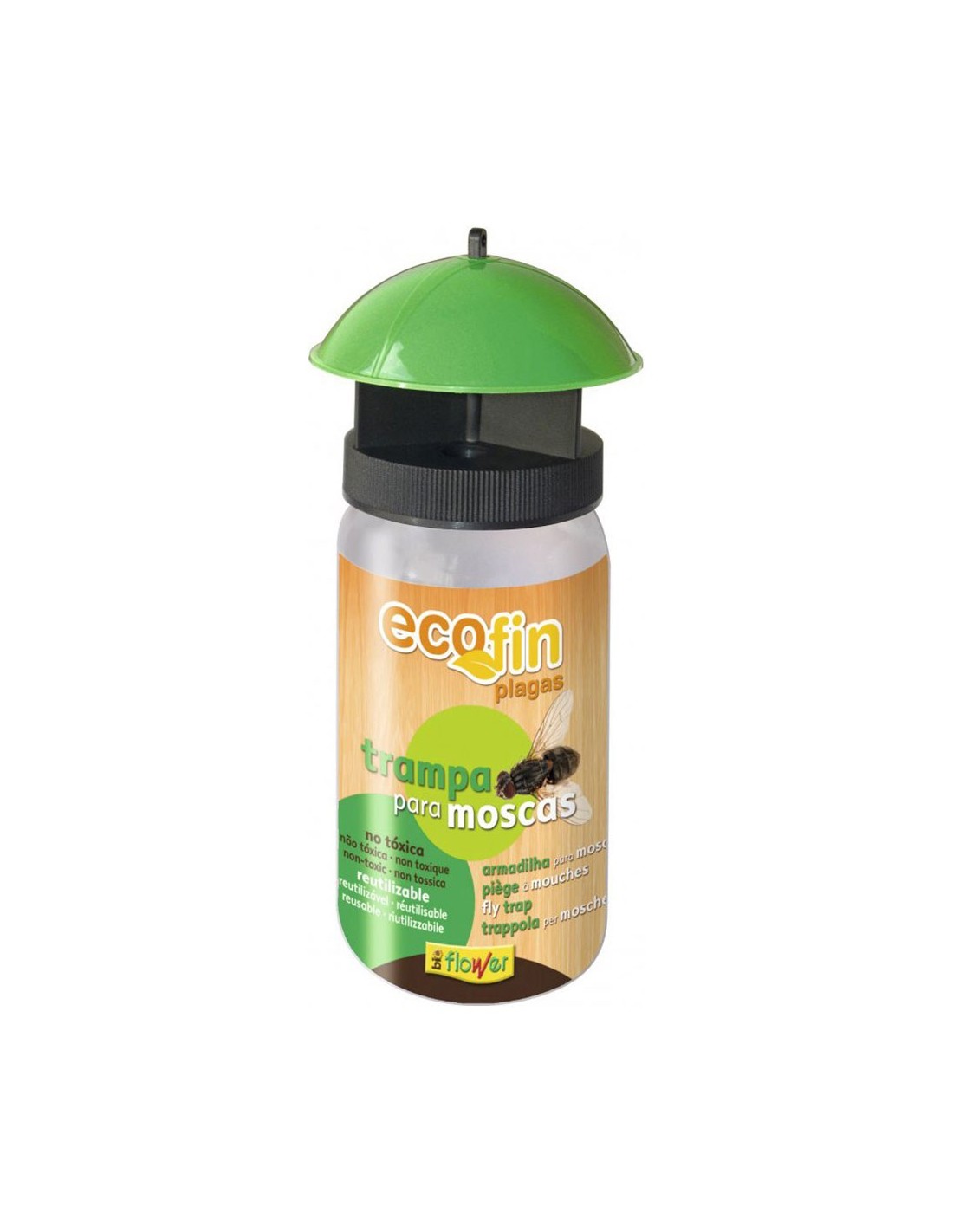 Trampa para moscas con cebo atrayente para todo tipo de moscas, modelo fin entran en la trampa y se quedan atrapadas sin poder salir. incluye 1 recipiente, 1 tapa + 1 cubierta, 1 bolsita con cebo atrayente y 1 alambre para sujeción en paredes no es tóxica y no contiene pesticidas, presentado en expositor de 12 uds
