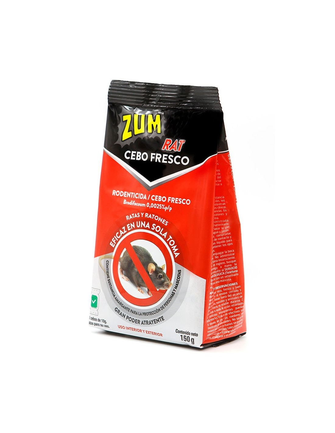 Cebo rodenticida fresco para ratas y ratones eficaz en una sola toma, gran poder atrayente, para interior y exterior. no se debe aplicar en áreas donde hay alimentos/piensos, bebidas, utensilios de cocina o en superficies de procesamiento de alimentos. contiene 150 g